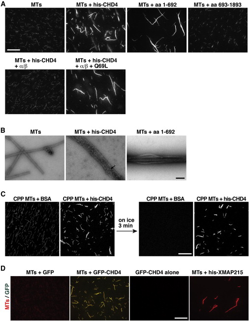 (B) EM analysis of MT bundles induced by CHD4 in (A) and stained with uranyl acetate. The arrow represents a large protein density. Scale bar represents 0.2 μm.