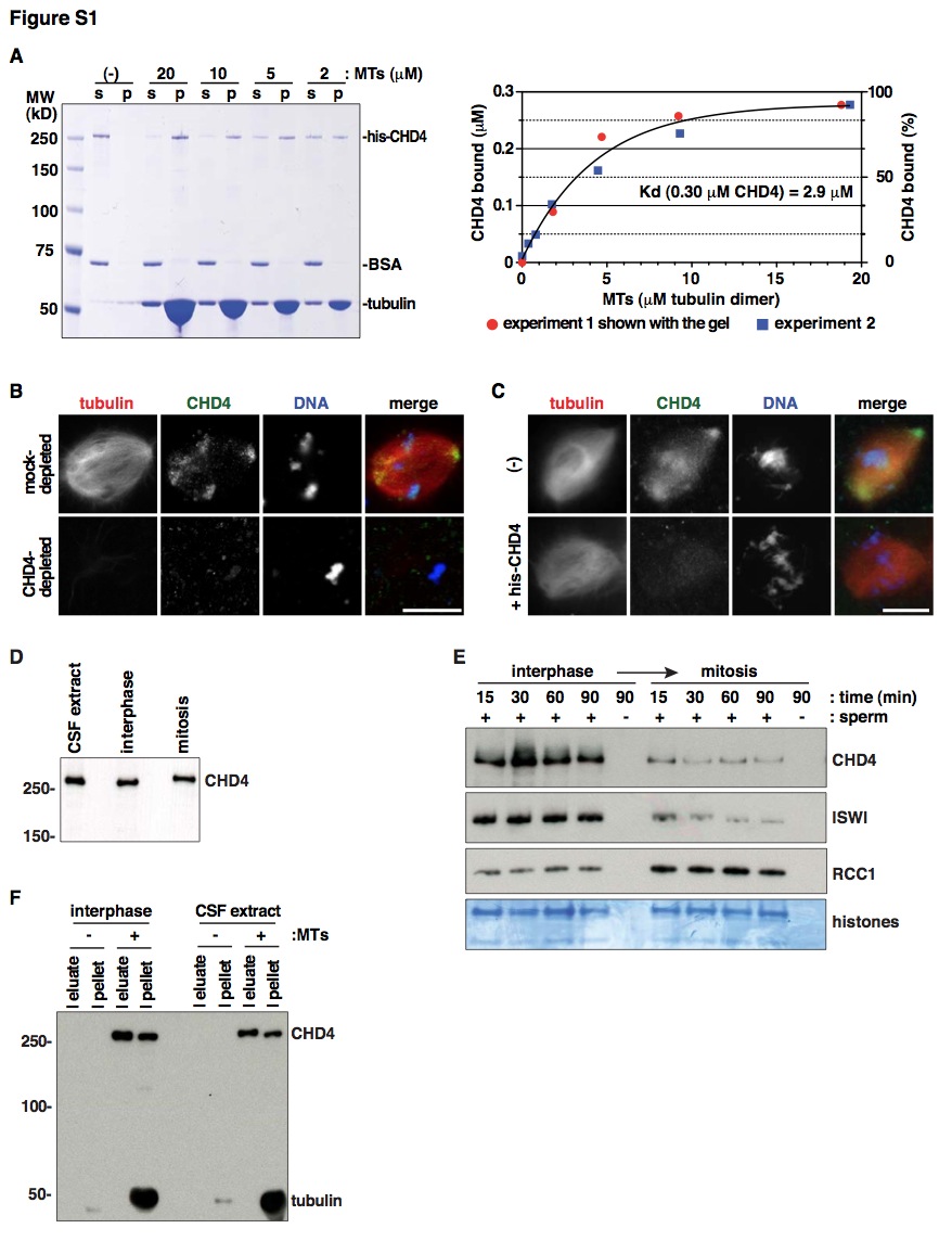 (A) CHD4 binds to MTs with moderate affinity. Recombinant CHD4 (0.30 μM, corresponding to the endogenous concentration in egg extracts) was incubated with increasing concentrations of taxol-stabilized MTs as indicated. After centrifugation, the supernatant (s) and pellet (p) were analyzed by Coomassie staining. Bound CHD4 was plotted versus the MT concentration, from two independent experiments. Because small amounts of MTs were depolymerized and recovered in the supernatant, we calculated actual MT concentrations from the tubulin in the pellet. The fitting curve was obtained using the Prism program (GraphPad Software), and the dissociation constant (Kd) was calculated as the concentration of MTs required to sediment half of the CHD4.