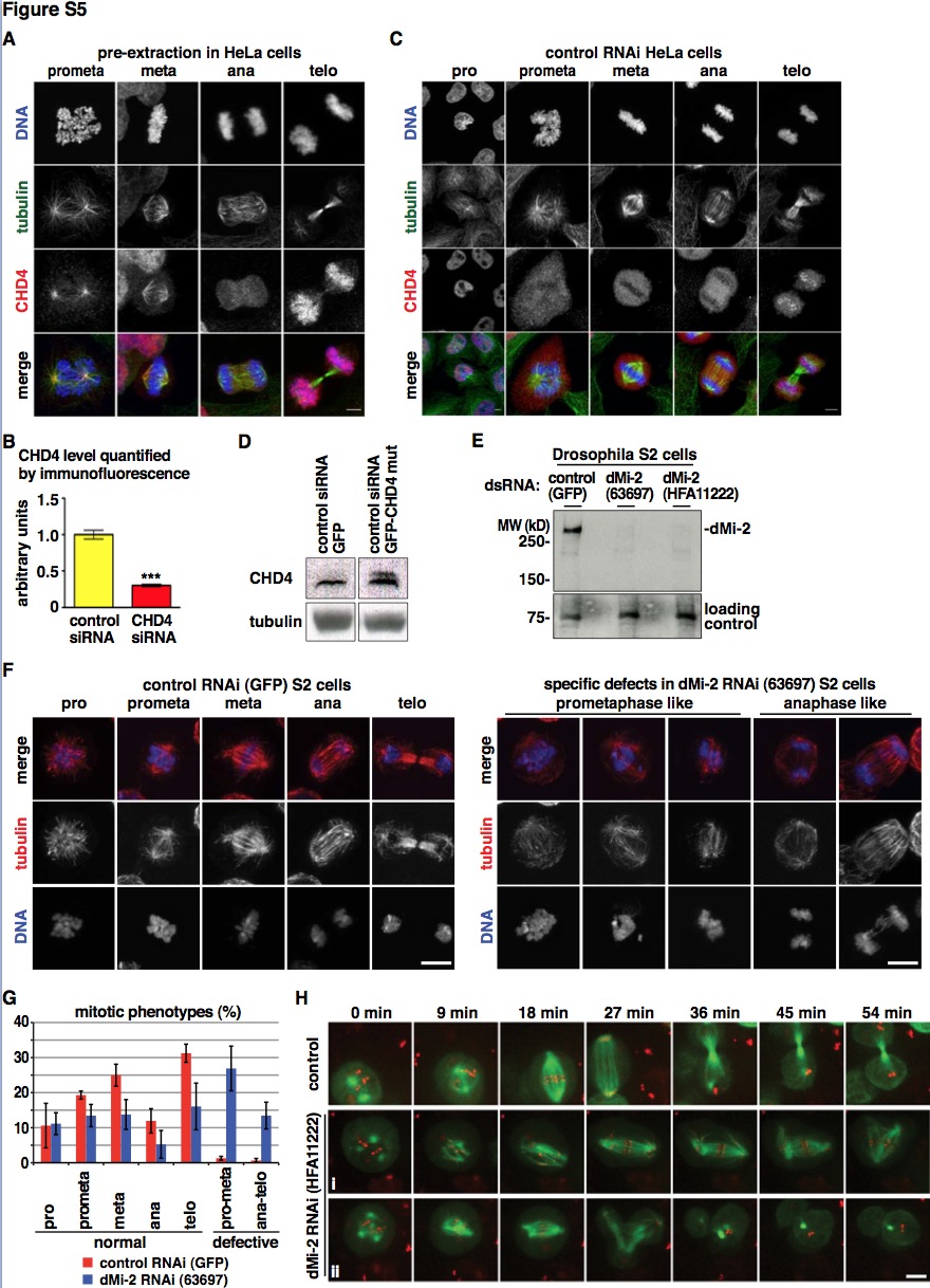 Figure S5. CHD4 is essential for spindle assembly and chromosome segregation in HeLa and Drosophila S2 cells, related to Figure 5