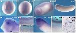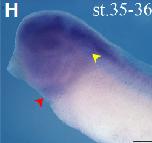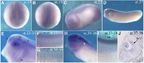 Fig. 1. Spatio-temporal expression pattern of kidins220 mRNA in Xenopus laevis embryos. The developmental stages (st.) are indicated in each panel (A,B) Initial neural tube stage embryos (st. 19), (A) frontal view, dorsal to the top and (B) dorsal view, anterior to the bottom, respectively. (C) Early tail bud stage (st. 22) embryo showing kidins220 expression at the level of the head and in somites. In (A) and (C) the square brackets indicate the forming somites). (D) st. 27 embryo in which the labeled ophtalmic and maxillomandibular branches of the primordium of the trigeminal nerve are highlighted by white and light blue arrowheads, respectively. (E) Magnified view of st.33-34 embryo head, showing signal in forebrain (f), midbrain (m) hindbrain (h), eye vesicle (e), branchial arches (ba). Magnification of the somite region in stage 33-34 embryos, hybridized with Kidins220 (F) and mastr, respectively (G). The square brackets indicate individual somites. (H) Anterior portion of st. 35-36 embryo showing signal in the heart region (red arrowhead) and in otic vesicle (yellow arrowhead). (I) Magnification of somites and dorsal fin of stage 37-38 hybridized embryos. (C-I) Lateral views, anterior to the left, dorsal to the top. (J) Transverse microtome section of hybridized st. 37-38 embryo showing a specific signal in retinal ganglion cells (rgc) and in lens (l). Scale bars: (A-I) 250 um; (J) 50 um.