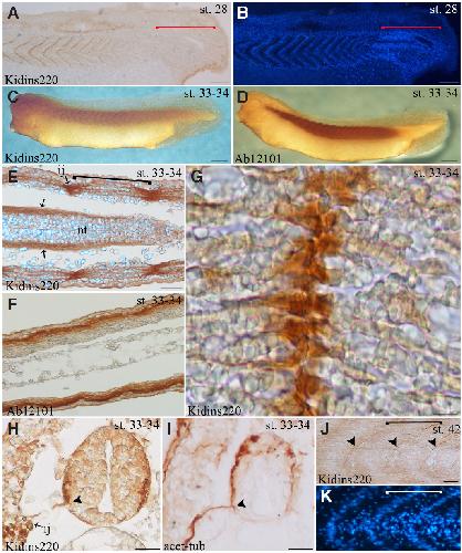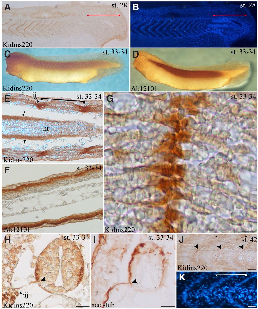 Fig. 2. Kidins220 localization pattern in somites and spinal neurons of DAB-stained embryos. Lateral views, anterior to the left, dorsal to the top (A-D). Sagittal section of a Kidins220-immunostained embryo (A) and Hoechst-counterstaining (B). The red square brackets indicate paraxial mesoderm. Whole-mount ab34790 anti-Kidins220-immunostaining (C) and Ab12101 anti muscle-immunostaining (D). Coronal sections of Kidins220 (Hoechst-counterstained) and Ab12101-stained embryos, respectively (E,F). The arrows in (E) show the Kidins220 signal in lateral regions of spinal cord. High magnification of a Kidins220-positive intersomitic junction (G). Transverse sections of Kidins220 and acetylated tubulin-immunostained embryos, respectively (H,I): the arrowheads show the exit point of a motor neuron that in (H) resulted broken because of sectioning. Sagittal section of a stage 42 embryo (J) and Hoechst-counterstaining (K). The arrowheads in (J) indicate motor neurons. The square brackets in (E,J,K) span somite length. Acet. tub.= acetylated tubulin; nt= neural tube; ij= intersomitic junction. Scale bars: (A,B,H,I) 50 um; (C,D) 250 um; (E,F) 25 um; (G,J,K) 10 um.