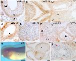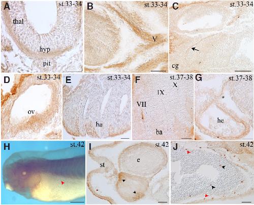 3. Kidins220 expression in other different developmental regions of DAB-stained embryos. Coronal and transverse sections showed that Kidins220 was expressed in: hypothalamus and thalamus (A), trigeminal nerve (V) (B), the mandibular branch (arrow) of trigeminal nerve innervating the cement gland (C), otic vesicle (D), branchial arches (E), VII, IX, X cranial nerves (F), heart (G). Lateral view of the anterior portion of a whole-mount Kidins220-immunolabeled stage 42 embryo (H). Sagittal sections showing a view of head (I) and abdomen (J). (H-J) Anterior to the left, dorsal to the top. The red arrowheads in (H,J) indicate Kidins220-immunopositive cells around the intestine. The black arrowheads in (I) show the Kidins220 signal in the edges of a cranial muscle. The black arrowheads in (J) indicate a Kidins220-immunopositive cell localized in intestine wall. ba, branchial arches; cg, cement gland; e, eye; he, heart; hyp, hypothalamus; ov, otic vesicle; pit, pituitary; thal, thalamus; st, stomodeum. Scale bars: (A,B,D,G) 25 um; (C) 100 um; (E,F,I,J) 50 um; (H) 250 um.