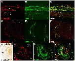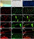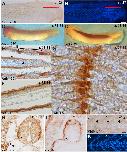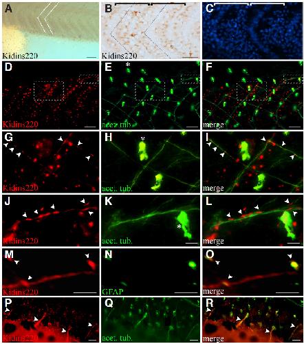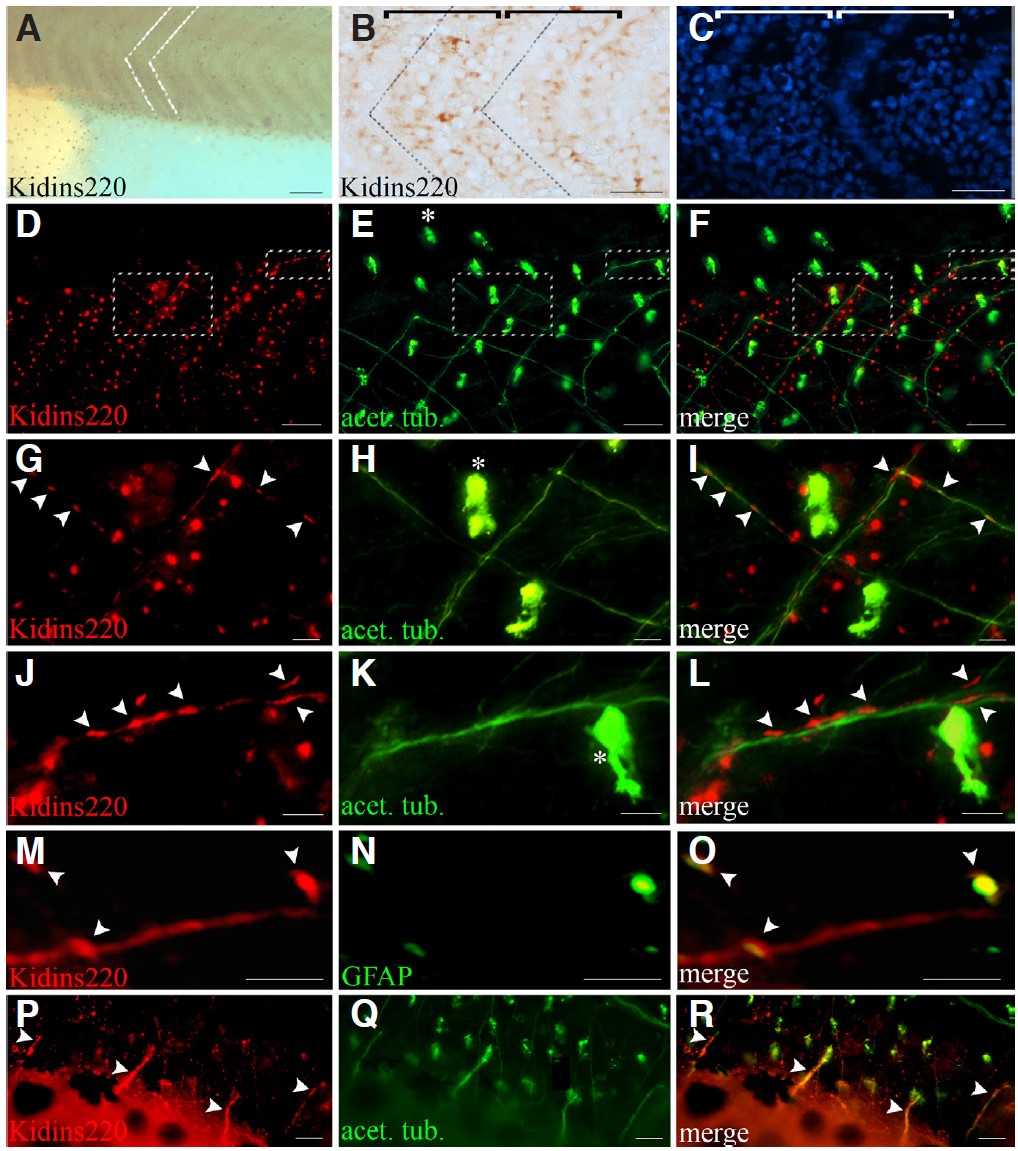 Fig. 4. Whole mount immunohistochemistry experiments on stage 42 embryos. Lateral view of a posterior portion of DAB-stained embryo for Kidins220 (A). Parasagittal section performed laterally between the skin and the somites of an immunostained embryo (B) and Hoechst-counterstaining (C). Dashed lines in (A,B) highlight the pattern of the Kidins220 signal, organized in irregularly parallel rows to the side of intersomitic junctions. The square brackets in (B,C) span somite length. Lateral view of somite region of whole-mount double immunofluorescent staining for Kidins220 (red signal) and acetylated tubulin (green signal) (D-F). Magnified views of neurons in somite region (G-I), dorsal fin (J-L; M-O), abdominal region (P-R). The largest dashed box in (D) indicates the region magnified in (G-I); the smallest one, the region magnified in (J-L). White arrowheads in (G,I,J,L,M,O) highlight the spotted signal of kidins220 at some neural fiber. White arrowheads in (M,O) show specific cells in dorsal fin, positive for both Kidins220 and GFAP. The asterisks in (E,H,K) denote the acetylated tubulin-positive but Kidins220-negative ciliated cells. Scale bars: (A) 125 um; (B-F,J-O) 50 um; (G-I,P-R) 10 um.