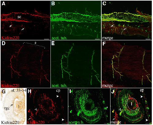 Fig. 5. Sagittal cryosections of stage 42 embryos double-labeled for Kidins220 (red) and acetylated tubulin (green) by immunofluorescent staining. Kidins220-positive signal was present in dorsal and ventral regions of the spinal cord as well as in motor neurons (arrows) (A) as shown by the acetylated tubulin staining (B,C). Magnification of motor neurons double-stained by Kidins220 (D), acetylated tubulin (E) and merged (F). The dashed bar in (D) spans the somite length. Kidins220 protein in eye of st. 33-34 DAB-stained embryos (G) and st. 42 embryos double-immunolabeled for Kidins220 and acetylated tubulin (H-J). The open arrowhead in (H,J) indicates the Kidins220 signal in the optic nerve. The dashed circle indicates the position of lens in the eye. The white arrow in (H,J) denotes the presence of Kidins220 signal in a facial muscle near the eye. The white arrowheads in (H,J) indicate Kidins220 and acetylated tubulin-positive nerve fibers present in epidermis. ep, epidermis; l, lens; rgc, retinal ganglion cell; s, somite; sc, spinal cord; *, ciliated cell. Scale bars: (A-C) 50 um; (D-F,G-J) 25 um.