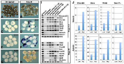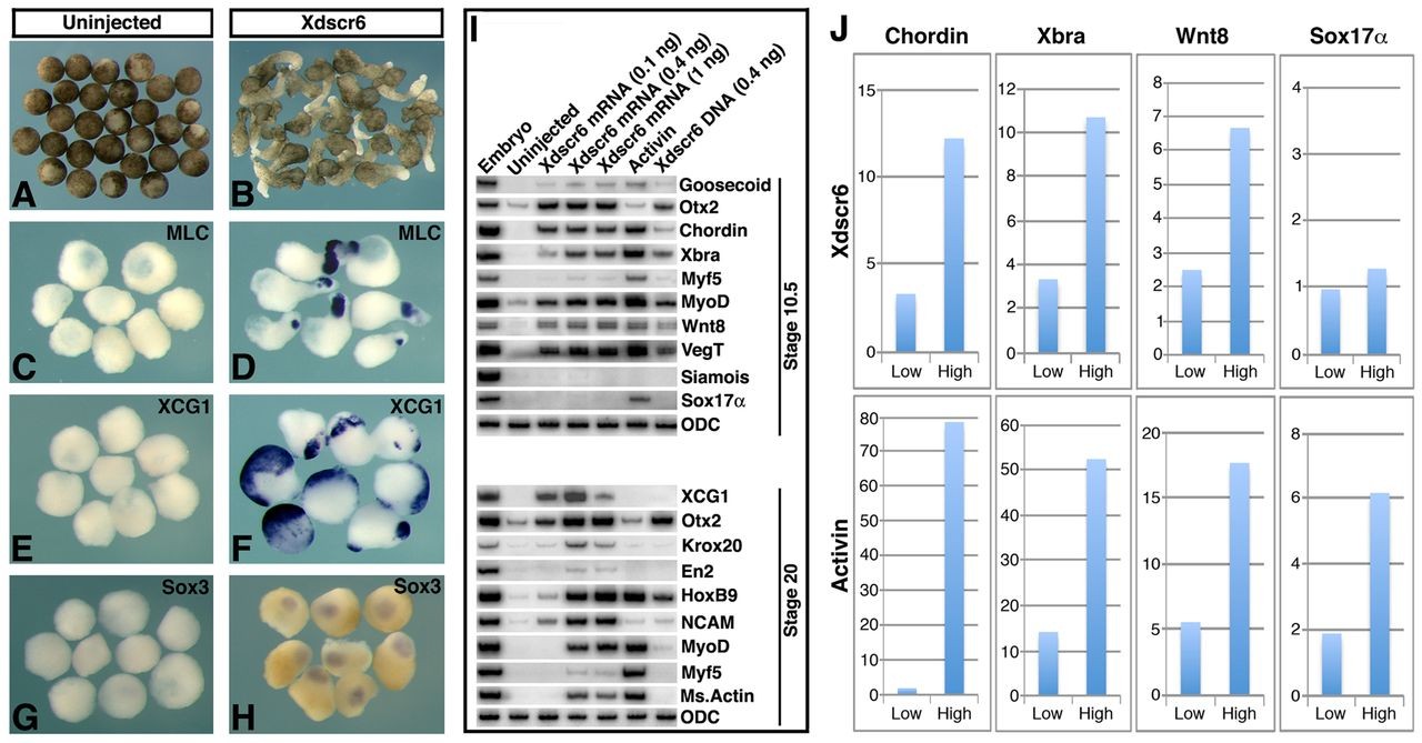 Fig. 1. XDSCR6 triggers the formation of dorsal mesoderm and neural tissues in Xenopus ectoderm explants. (A,B) Morphology of control (A) and Xdscr6-injected (B) explants at the early neurula stage equivalent. (C-H) In situ hybridisation analyses of the expression of MLC, XCG1 and Sox3 genes in control (C,E,G) and Xdscr6-injected (D,F,H) ectoderm explants at the late neurula stage equivalent. (I) RT-PCR analyses of gene expression in ectoderm explants cultured to stage 10.5 and 20 equivalent, following injection of the indicated amounts of Xdscr6 mRNA, Xdscr6 DNA or after activin treatment. ODC was used as a loading control. Ms., muscle specific. (J) Real-time RT-PCR analyses of the expression level of the indicated genes in early gastrula ectoderm explants injected with low and high amounts of Xdscr6 mRNA (top row) or treated with low and high doses of activin (bottom row). Similar results were obtained using ODC or EF1α as reference.