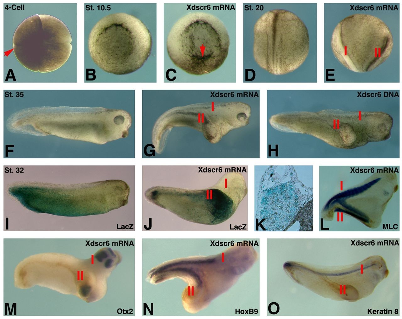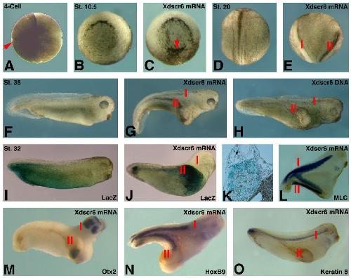 Fig. 2. XDSCR6 induces a secondary embryonic axis. (A) Xdscr6 mRNA or DNA was injected into one ventral blastomere (arrow) at the 4-cell stage. (B,C) Vegetal view of an uninjected early gastrula embryo (B) and a Xdscr6 mRNA-injected early gastrula embryo showing the precocious formation of the ventral blastopore (C, arrow). (D,E) Dorsal view, with anterior region at the top, of an uninjected late neurula embryo (D) and a Xdscr6 mRNA-injected late neurula embryo with a secondary neural tube (E). (F-H) Phenotypes of control (F), Xdscr6 mRNA-injected (G) and Xdscr6 DNA-injected (H) embryos at stage 35. (I,J) β-galactosidase staining of stage 32 embryos injected with lacZ mRNA alone (I) or co-injected with Xdscr6 mRNA (J). (K) Transverse section corresponding to J showing β-galactosidase staining in XDSCR6-induced muscles. (L-O) In situ hybridisation analyses of the expression of the indicated genes in Xdscr6 mRNA-injected embryos at stage 32. I and II designate the primary axis and the secondary axis, respectively.
