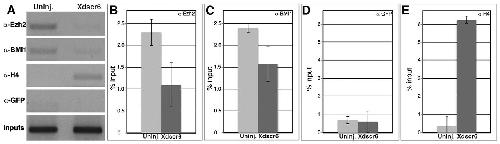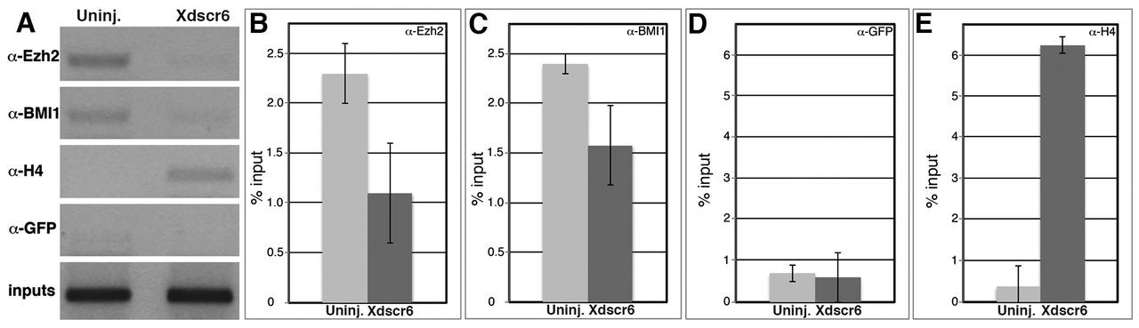 Fig. 8. XDSCR6 releases endogenous Ezh2 and BMI1 from the goosecoid promoter. ChIP experiments using uninjected (uninj.) or Xdscr6-injected Xenopus ectoderm explants. (A) A representative semi-quantitative PCR result. (B-E) Quantitative PCR analyses of the goosecoid promoter using chromatin immunoprecipitated from uninjected or Xdscr6-injected ectoderm explants by the indicated antibodies. Data represent the mean of triplicate experiments (error bars indicate s.d.).