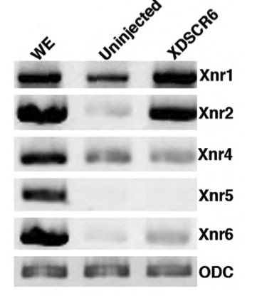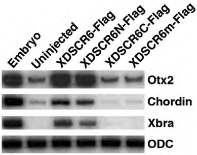 Fig. S2. XDSCR6 differentially induces the expression of nodal-related genes. Embryos at the 2-cell stage were injected at the animal pole region with Xdscr6 mRNA (0.5 ng), RT-PCR analyses were performed on control embryo and dissected ectoderm explants at the early gastrula stage.