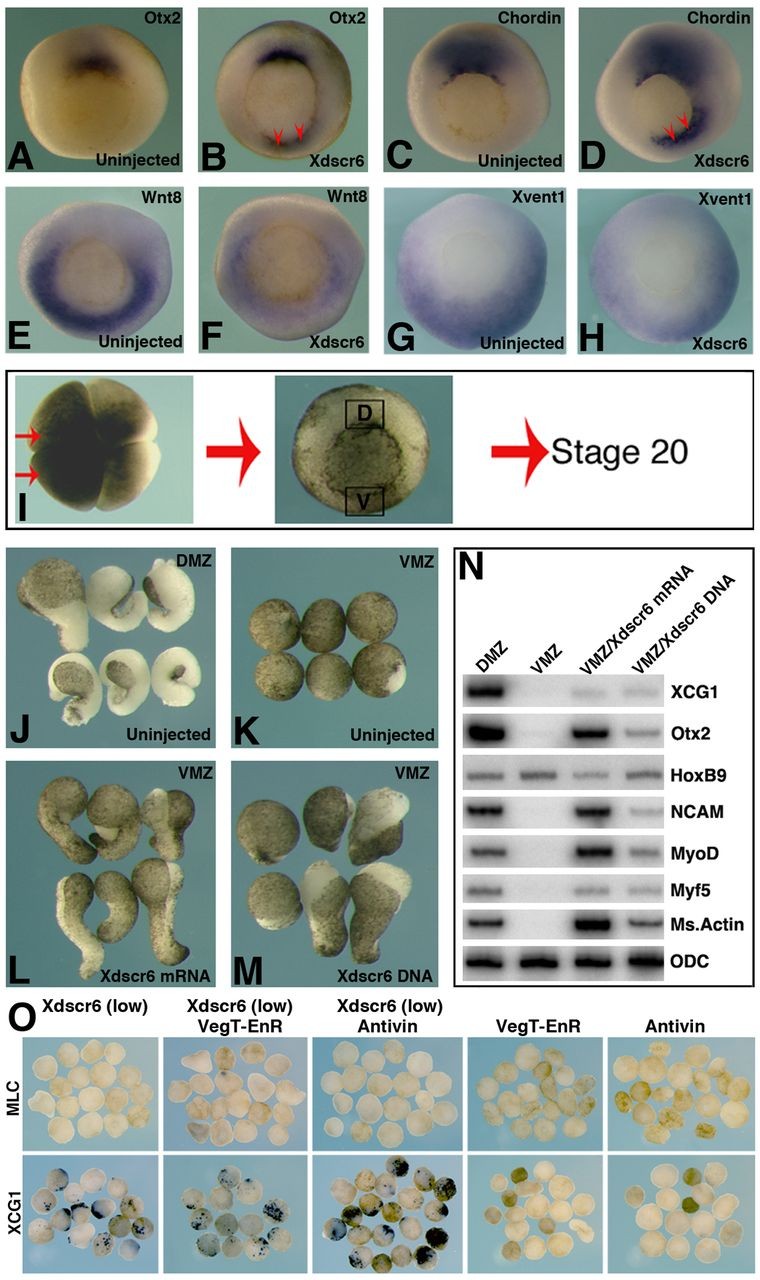 Fig. 3. Dorsalisation of ventral mesoderm by XDSCR6. (A-H) In situ hybridisation analyses of Otx2, chordin, Wnt8 and Xvent1 expression in uninjected (A,C,E,G) and Xdscr6-injected (B,D,F,H) embryos at the early gastrula stage. Ectopic Otx2 and chordin expression sites are indicated by arrowheads. (I) Scheme of the dorsalisation experiment. Embryos were ventrally injected at the 4-cell stage (double arrows) and DMZ (D) or VMZ (V) explants were dissected at the early gastrula stage and cultured to late neurula stage equivalent. (J-M) Morphology of the uninjected and injected DMZ or VMZ explants. (N) RT-PCR analyses of gene expression in uninjected and injected DMZ or VMZ explants. (O) In situ hybridisation of MLC and XCG1 expression in ectoderm explants injected with the mRNAs indicated at the top and cultured to late neurula stage equivalent. DMZ, dorsal marginal zone; VMZ, ventral marginal zone.