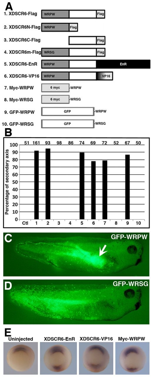 Fig. 5. The WRPW motif is necessary and sufficient to induce a secondary axis. (A) Structure of the various Xdscr6 constructs. (B) Summary of secondary axis formation in control (Ctl) and injected embryos (constructs numbered as in A). XDSCR6 (1), XDSCR6N (2), XDSCR6-EnR (5), XDSCR6-VP16 (6), myc-WRPW (7) and GFP-WRPW (9) similarly induce a secondary axis, whereas XDSCR6C (3), XDSCR6m (4), myc-WRSG (8) and GFP-WRSG (10) have no effect. The results are expressed as a percentage and numbers at the top indicate total embryos scored from three independent experiments. (C) A GFP-WRPW-injected stage 35 embryo with green fluorescence concentrated in the anterior region of the secondary axis (arrow). (D) A GFP-WRSG-injected embryo lacks a secondary axis, with green fluorescence distributed in the posterior region. (E) In situ hybridisation analyses of chordin expression at stage 10.5 following overexpression of XDSCR6-EnR, XDSCR6-VP16 or myc-WRPW in the ventro-vegetal region at the 4-cell stage. All embryos are in vegetal view.