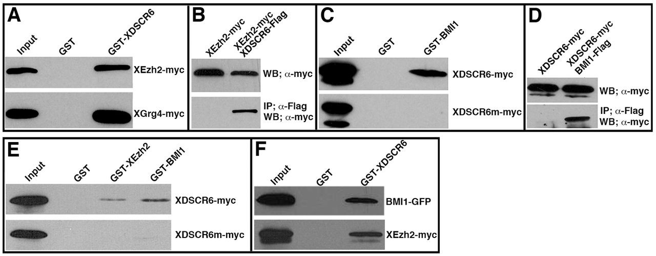 Fig. 6. XDSCR6 physically interacts with PcG proteins. (A) GST pull-down of embryonically expressed XEzh2-myc or XGrg4-myc by GST-XDSCR6. (B) Co-immunoprecipitation of XEzh2-myc by XDSCR6-Flag. (C) GST pull-down of embryonically expressed XDSCR6-myc, but not the mutant XDSCR6m-myc, by GST-BMI1. (D) Co-immunoprecipitation of XDSCR6-myc by BMI1-Flag. (E) GST pull-down of in vitro translated XDSCR6-myc, but not the mutant XDSCR6m-myc, by GST-XEzh2 or GST-BMI1. (F) GST pull-down of in vitro translated BMI1-GFP or XEzh2-myc by GST-XDSCR6. IP, immunoprecipitation; WB, western blot.