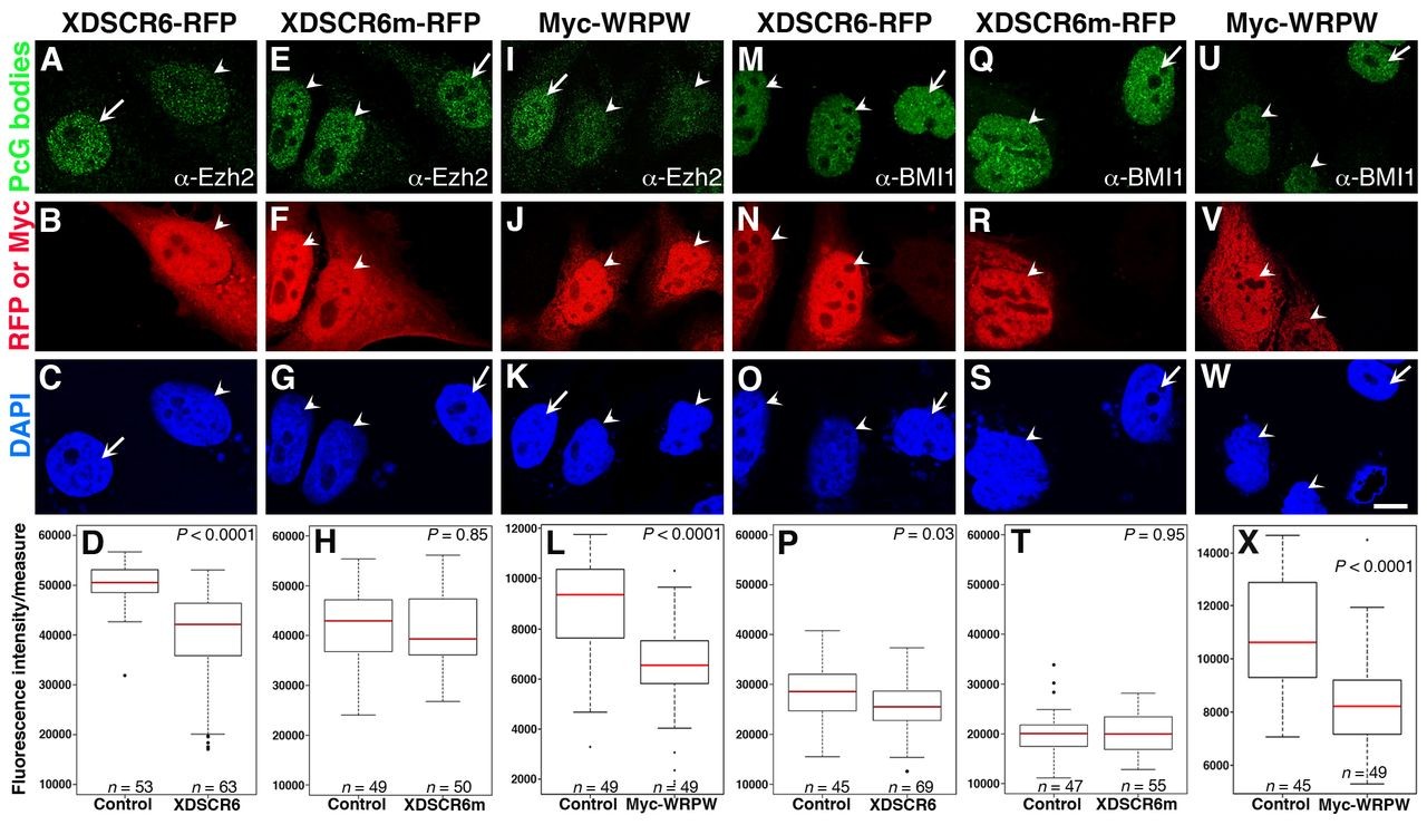 Fig. 7. XDSCR6 interferes with the nuclear localisation of endogenous Ezh2 and BMI1. Confocal microscopy analyses of Ezh2- and BMI1-associated PcG bodies in HeLa cells. In cells transfected with Xdscr6-RFP or myc-WRPW (arrowheads in A-C,M-O,I-K,U-W), the intensity of endogenous Ezh2 and BMI1 staining is significantly decreased compared with neighbouring untransfected cells in the same culture dish (arrows). In Xdscr6m-RFP-transfected cells (arrowheads in E-G,Q-S), the intensity of fluorescence is comparable to that of neighbouring untransfected cells (arrows). Scale bar: 10 μm. (D,H,L,P,T,X) Quantification of nuclear fluorescence intensity. Red lines represent the median for each condition. Data are presented as mean ± s.e.m. P-values (Studentâs t-test) and number of measures (n) are indicated.