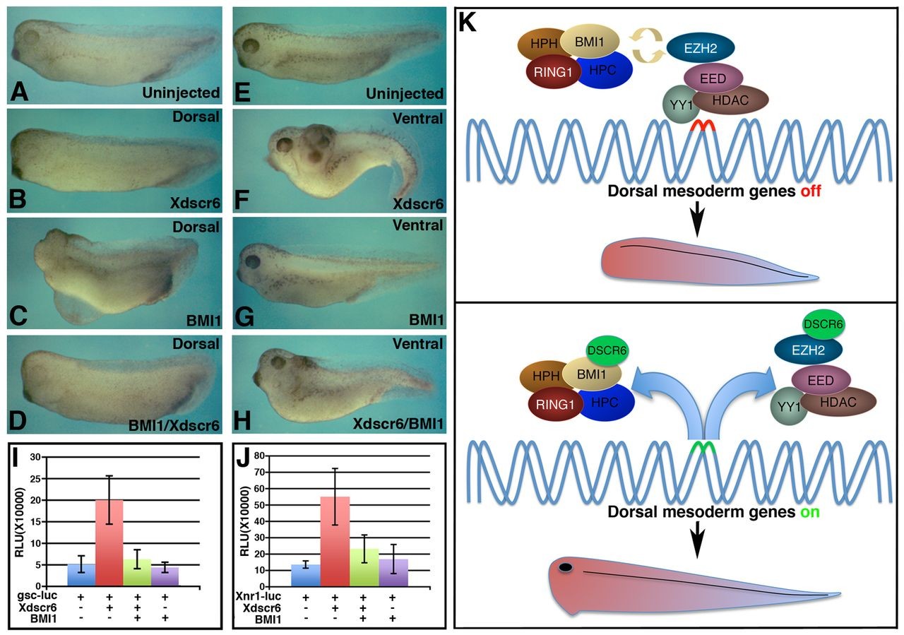 Fig. 9. XDSCR6 and BMI1 are mutually antagonistic during embryonic axis formation. (A-D) XDSCR6 rescues anterior deficiency produced by BMI1 overexpression. Embryos at the 4-cell stage were either left uninjected (A) or dorsally injected with Xdscr6 mRNA (B), BMI1 mRNA (C) or co-injected with BMI1 and Xdscr6 mRNAs (D), and cultured to the stage 32. (E-H) BMI1 inhibits the axis-inducing activity of XDSCR6. Embryos at the 4-cell stage were either left uninjected (E) or ventrally injected with Xdscr6 mRNA (F), BMI1 mRNA (G) or co-injected with BMI1 and Xdscr6 mRNAs (H), and cultured to the stage 35. (I,J) BMI1 represses the goosecoid promoter (gsc-luc) and Xnr1 promoter (Xnr1-luc) activity that had been stimulated by overexpression of XDSCR6 in ectoderm explants. Values were expressed relative to the value obtained from uninjected control explants. Mean ± s.e.m.; P<0.05 (Studentâs t-test). RLU, relative luciferase units. (K) Model of XDSCR6 function in transcriptional derepression. (Top) In the absence of XDSCR6, PcG proteins bind to chromatin and repress the transcription of mesoderm genes. (Bottom) The interaction between XDSCR6 and PcG proteins removes PRC1 and PRC2 from chromatin and contributes to transcriptional derepression.