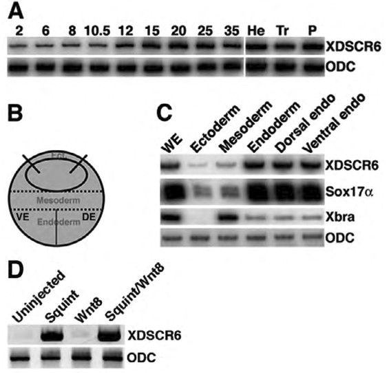 Fig. S1. RT-PCR analyses of the expression and distribution of Xdscr6 transcripts during early development. (A) Temporal expression of Xdscr6 at various stages (numbers on the top) and its distribution at stage 35 in the head (He), trunk (Tr) and posterior (P) regions. (B) Schema showing the dissection of different early gastrula tissues including ectoderm (ect), mesoderm, endoderm, dorsal endoderm (DE) and ventral endoderm (VE). (C) RT-PCR analyses of the distribution of Xdscr6 transcripts in different regions of the early gastrula. (D) Induction of Xdscr6 expression in early gastrula ectoderm following overexpression of squint and Wnt8. ODC was used as an input control.