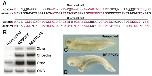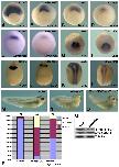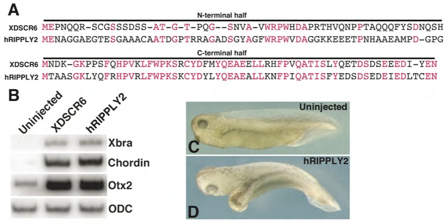Fig. S3. Comparison of sequence and activity between Xenopus and human RIPPLY2 proteins. (A) Sequence alignment. Conserved residues are indicated in red. The amino- and carboxyl-terminal halves of XDSCR6 used for functional analyses are indicated. (B) RT-PCR analyses of the activity of XDSCR6 and human RIPPLY2 in mesoderm gene expression at the early gastrula stage. (C) A control embryo at the stage 33. (D) Induction of a partial secondary axis by human RIPPLY2. The frequency of this induction is similar as XDSCR6 (not shown).