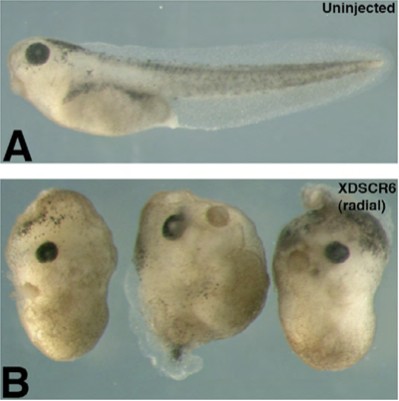 Fig. S4. Uniform expression of XDSCR6 suppresses trunk and posterior development. Embryos at the 8-cell stage were radially injected with Xdscr6 mRNA (0.4 ng) at the equatorial region and live images of control (A) and injected (B) embryos were taken at larval stage 41. Note that embryos radially injected with Xdscr6 lacks trunk and posterior regions.