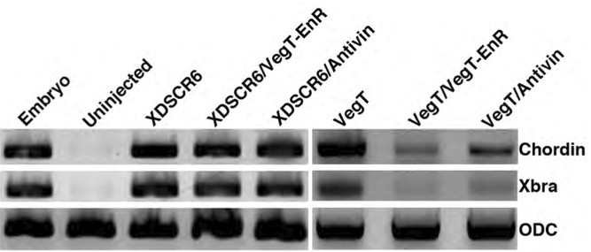 Fig. S5. XDSCR6 induces chordin and Xbra expression independently of nodal signalling. Embryos at the 2-cell stage were injected at the animal pole region with low amount of Xdscr6 mRNA alone or coinjected with VegT-EnR mRNA or antivin mRNA. They were also injected with VegT mRNA (40 pg) or coinjected with VegT-EnR mRNA or antivin mRNA. RT-PCR analyses on control embryo and dissected ectoderm explants were performed at the early gastrula stage. VegT-EnR and antivin does not block the activity of XDSCR6, but inhibits the activity of VegT.