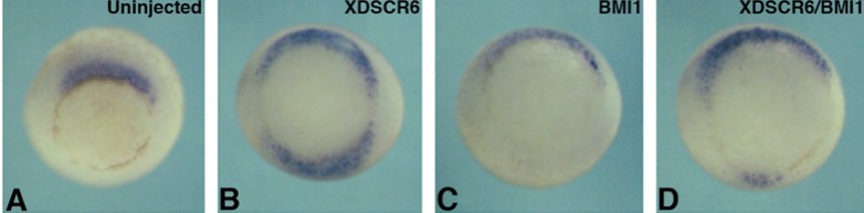 Fig. S7. BMI1 inhibits ectopic chordin expression induced by XDSCR6. Embryos at the 4-cell stage were ventrally injected with Xdscr6 mRNA alone, BMI1 mRNA alone or coinjected with Xdscr6 and BMI1 mRNA. In situ hybridization was performed at the early gastrula stage.
