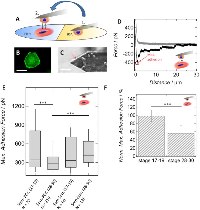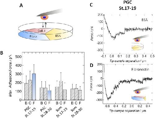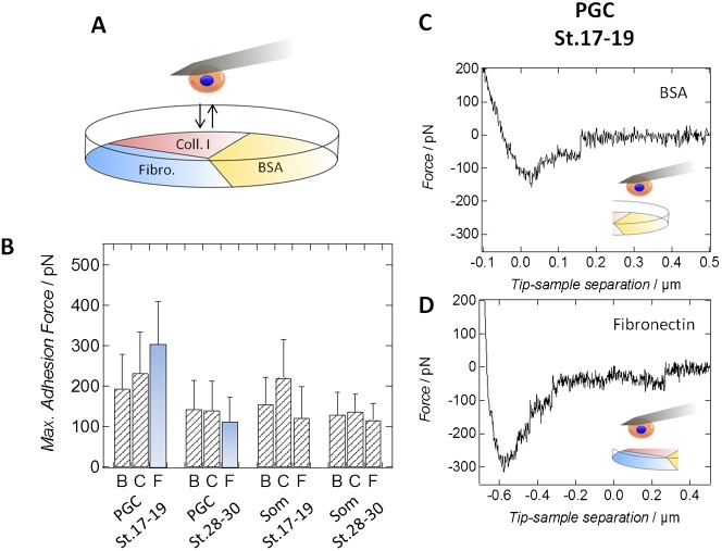 Fig. 3. Pre-migratory PGCs show high affinity to fibronectin.(A) Schematic drawing of a Petri dish being divided into three sectors coated either with fibronectin, collagen I or bovine serum albumin (BSA). Either PGCs or somatic cells from both stages were brought into contact with the different substrates using single-cell force spectroscopy. (B) Maximum adhesion forces of either PGCs or somatic cells (Som) isolated from GFP_DELE mRNA injected embryos at developmental stage 17–19 (pre-migratory PGCs) or stage 28–30 (migratory PGCs) during interaction with BSA (B), collagen I (C) or fibronectin (F) coated surfaces. The most relevant change in interaction, the decline in binding strength of PGCs to fibronectin during development, is shown in blue bars. At least 37 force curves per category have been recorded and analyzed. Values are obtained from AFM force-distance curves. Negative forces correspond to positive adhesion forces. Error bars show standard deviations. All p-values obtained from either Wilcoxon rank sum tests or two-tailed t-tests are given in supplementary material Table S2. (C,D) Typical AFM force-distance curves monitoring the interaction of a pre-migratory primordial germ cell with a (C) BSA-coated and a (D) fibronectin-coated part of the Petri dish.