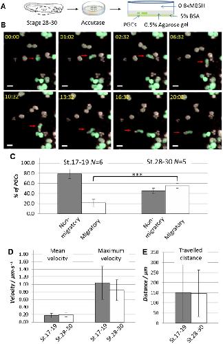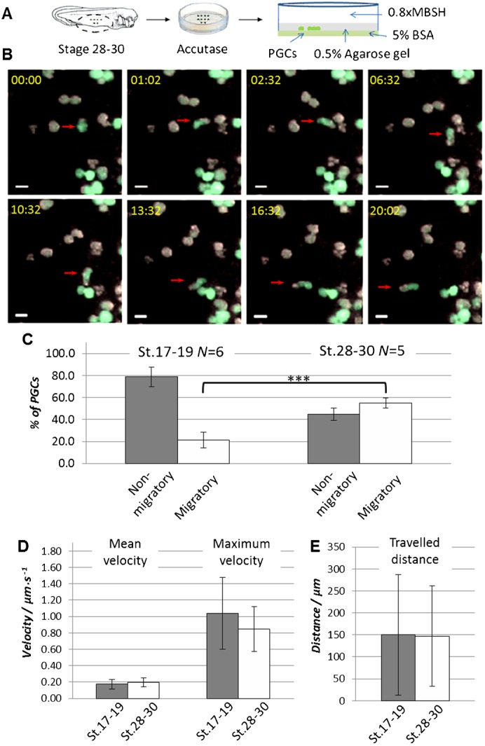 Fig. 4. X. laevis PGC can migrate in vitro in the under-agarose migration assay.(A) Ventral explants were dissected from the embryos at developmental stage 17–19 or 28–30 injected at 2-cell stage vegetally with GFP_DELE mRNA to label PGCs. Explants were treated with accutase and the dissociated cells were transferred between 0.5% agarose gel and a 5% BSA-coated Petri dish in 0.8× MBSH buffer. (B) Time-lapse images of an under-agarose migration assay with dissociated endodermal cells from stage 28–30 embryos. PGCs can be identified as GFP-positive (green) in contrast to the GFP-negative somatic cells. Red arrows indicate migrating PGC. Relative time from the start of the time-lapse imaging is shown in the upper left corner of each image panel (min:sec). Scale bars: 20 µm. (C) Time-lapse microscopy was used to monitor the behavior of PGCs. Relative amount of migratory and non-migratory cells in the total amount of analyzed PGCs was calculated for each experiment. N – number of experiments. Error bars represent standard deviation. *** corresponds to P<0.001 (two-tailed t-test). (D,E) Migrating cells from stage 17–19 (n = 17) and stage 28–30 (n = 28) were used for the tracking analysis. Diagrams represent mean and maximum velocity of the cells (D) and distance which migrating PGCs travelled from the start (E). Error bars represent standard deviation.
