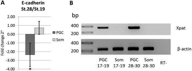 Fig. 2. E-cadherin is downregulated in migratory PGCs.(A) Relative amount of E-cadherin (cdh1) in PGCs and somatic endodermal cells (Som) isolated from stage 28–30 embryos (migratory PGCs) normalized to E-cadherin level in the corresponding cell type isolated from stage 17–19 embryos (pre-migratory PGCs) measured by quantitative RT PCR. Relative amount was calculated by ΔΔCt method (see Material and Methods) using three independent cDNA preparations. Error bars represent standard deviation. * corresponds to P<0.05 (two-tailed t-test). (B) Agarose gel electrophoresis of PCR quality control for cDNA used in qPCR analysis. In contrast to somatic cells, PGC-specific cDNA contains Xpat transcript. Amplification of β-actin is used as a positive control; a sample obtained from reverse transcription of endodermal cells without adding reverse transcriptase (RT-) was used as a negative control. Marker lane on the left side of the gel indicates the relative size of amplified products in base pairs (bp).