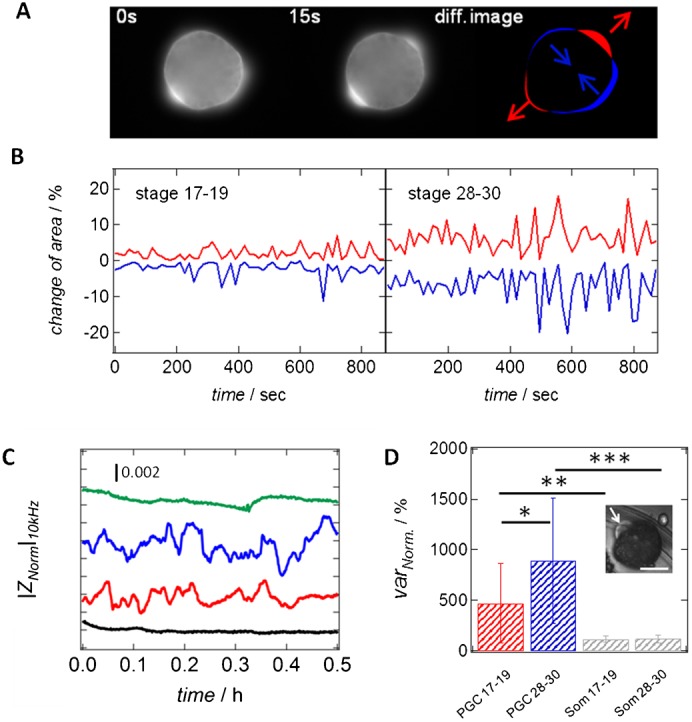 Fig. 5. PGCs isolated from tailbud stage embryos show high cellular motility.(A) Time-lapse fluorescence images of GFP-labeled PGCs from the migratory stage were taken with a time interval of 15 s. Subtracting two successive images from each other results in a difference image showing the expanding (red) and contracting (blue) regions of the cell over time. Arrows underscore the direction of expansion/contraction. (B) Time traces of the contracting (blue) and expanding (red) area of PGCs from the pre-migratory (stage 17–19) and the migratory (stage 28–30). Values are normalized to the current cell area at each time point and given in percentages. (C) Time-resolved, normalized and detrended impedance data of an uncovered electrode (black line), a single pre-migratory primordial germ cell (PGC stage 17–19, red line), a single migratory primordial germ cell (PGC stage 28–30, blue line) and a migratory primordial germ cell treated with 100 µM cytochalasin B (PGC stage 28–30, green line). All measurements were recorded at an excitation frequency of 10 kHz. The curves are arbitrarily shifted in the y-direction for better visibility. (D) Calculated variances obtained from time-resolved impedance data (C) for single pre-migratory primordial germ cell (PGC stage 17–19, n = 7, red) and single migratory primordial germ cell (PGC stage 28–30, n = 6, blue). Additionally, normalized variances of somatic endodermal cells from both stages of embryonic development (stage 17–19 with n = 4 and stage 28–30 with n = 6) are shown in grey. Values are given in percentages and normalized to the variance of the time-trace of an uncovered electrode (100%). N depicts the number of investigated cells per category. Error bars represent standard deviation. * corresponds to P-value<0.05 (P-value = 0.079), ** corresponds to P-value<0.1 (P-value = 0.028), *** corresponds to P-value<0.01 (P-value = 0.001). In all cases a Wilcoxon rank sum test was performed. Inlay: Single migratory PGC (stage 28–30) showing a strong formation of blebs (indicated by white arrow). Scale bar: 10 µm.