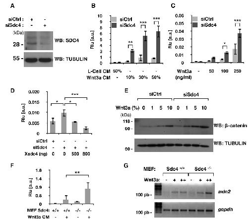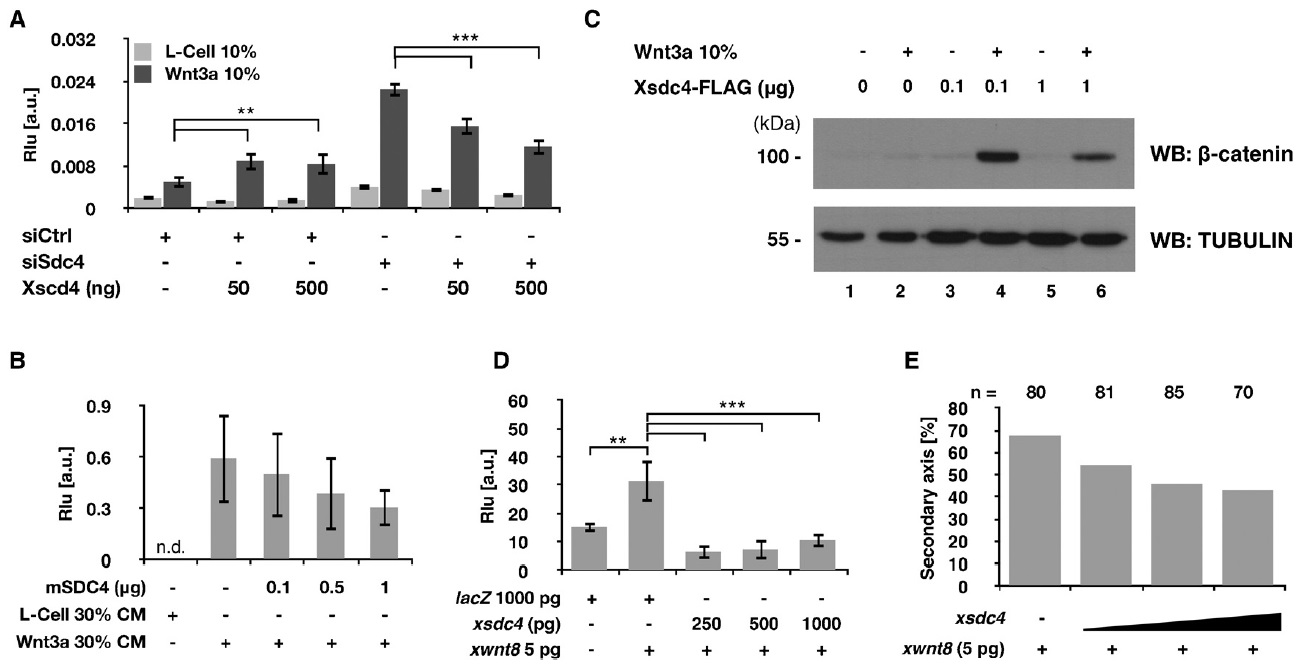 Fig. 2. SDC4 overexpression inhibits Wnt/-catenin signaling. (A) HeLa cells were co-transfected with Xsdc4 and siCtrl or siSdc4. Note that Xsdc4 overexpression in siCtrl-transfected cells has a dominant-negative effect, which is avoided when endogenous SDC4 was reduced by siSdc4 cotransfection. **p < 0.01; ***p < 0.001, by two-way ANOVAfollowed by Bonferroni post hoc test. (B) MEFs from Sdc4 −/− mice were transfected with mouse SDC4 (mSDC4) at increasing concentrations. Cells were stimulated asindicated and the TOPFlash activity measured. A consistently decrease of TOPFlash activity was induced by mSDC4 overexpression in a concentration-dependent manner,albeit statistically significant differences were not observed because of the intrinsic heterogeneity of MEFs. (C) L-Cells were transfected with siCtrl, siSDC4 and Xenopus SDC4(Xsdc4-FLAG) as indicated, and -catenin stabilization after 1 h of stimulation with Wnt3a CM or control CM was evaluated. (D) Xenopus embryos were injected with theindicated mRNAs in the four animal blastomeres at the 8-cell stage and incubated until stage 10.5. Embryos were pooled and lysed, and TOPFlash activity was measured.**p < 0.01; ***p < 0.001, by one-way ANOVA followed by Tukey post hoc test. (E) Xenopus embryos were injected with the indicated mRNAs in one ventral-vegetal blastomereat the 4-cell stage, and then incubated until neurula stages and secondary axis formation was measured. The graph represents the percentage of embryos with secondaryaxis in each treatment (secondary axis, [%]). n indicates the number of injected embryos, from three independent experiments. WB, Western Blot.