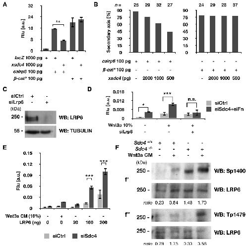 Fig. 4. Syndecan-4 inhibits Wnt/-catenin signaling at the LRP6 level. (A) Constitutive active LRP6 (calrp6) and constitutive active -catenin (ˇ-cat*) mRNAs were coinjectedwith lacZ (as a control) or xsdc4 as indicated, and Wnt/-catenin signaling was evaluated by TOPFlash assay. **p < 0.01, by one-way ANOVA followed by Tukey post hoc test.(B) Secondary axes were induced in Xenopus by injection of calrp6 or ˇ-cat* mRNAs in one ventral vegetal blastomere at the 4-cell stage. xsdc4 coinjection reduced secondaryaxis (secondary axis, [%]) induction by calrp6 by half; however, secondary axis formation induced by ˇ-cat* was not affected by xsdc4, even when ˇ-cat* was reduced torule out saturation of the system. n, number of embryos injected per treatment. (C and D) HeLa cells were cotransfected with a mixture of siSdc4 and siFn to potentiateWnt/-catenin signaling in response to Wnt3a. The knockdown of LRP6 using siRNA (siLrp6; C) completely abrogates this potentiation (D). *p < 0.05, ***p < 0.001, by two-wayANOVA followed by Bonferroni post hoc test; n.s., not significative. (E) HeLa cells were cotransfected with LRP6, which activates Wnt/-catenin signaling, and siCtrl or siSdc4.Knockdown of SDC4 increases LRP6 activity. ***p < 0.001, by two-way ANOVA followed by Bonferroni post hoc test. (F) MEFs from Sdc4 +/+ and Sdc4 −/− mice were stimulatedwith L-Cell CM or Wnt3a CM by 30 min, and then lysed and membrane-enriched fractions were prepared and separated by SDS-PAGE, and probed with anti phospho-LRP6antibodies to evaluate endogenous LRP6 phosphorylation. fand fcorrespond to two independent experiments. P-LRP6/LRP6 ratios are indicated for fand f. For TOPFlashassays, representative experiments are shown, and each experiment was performed at least n = 3. WB, Western Blot.