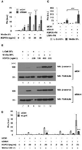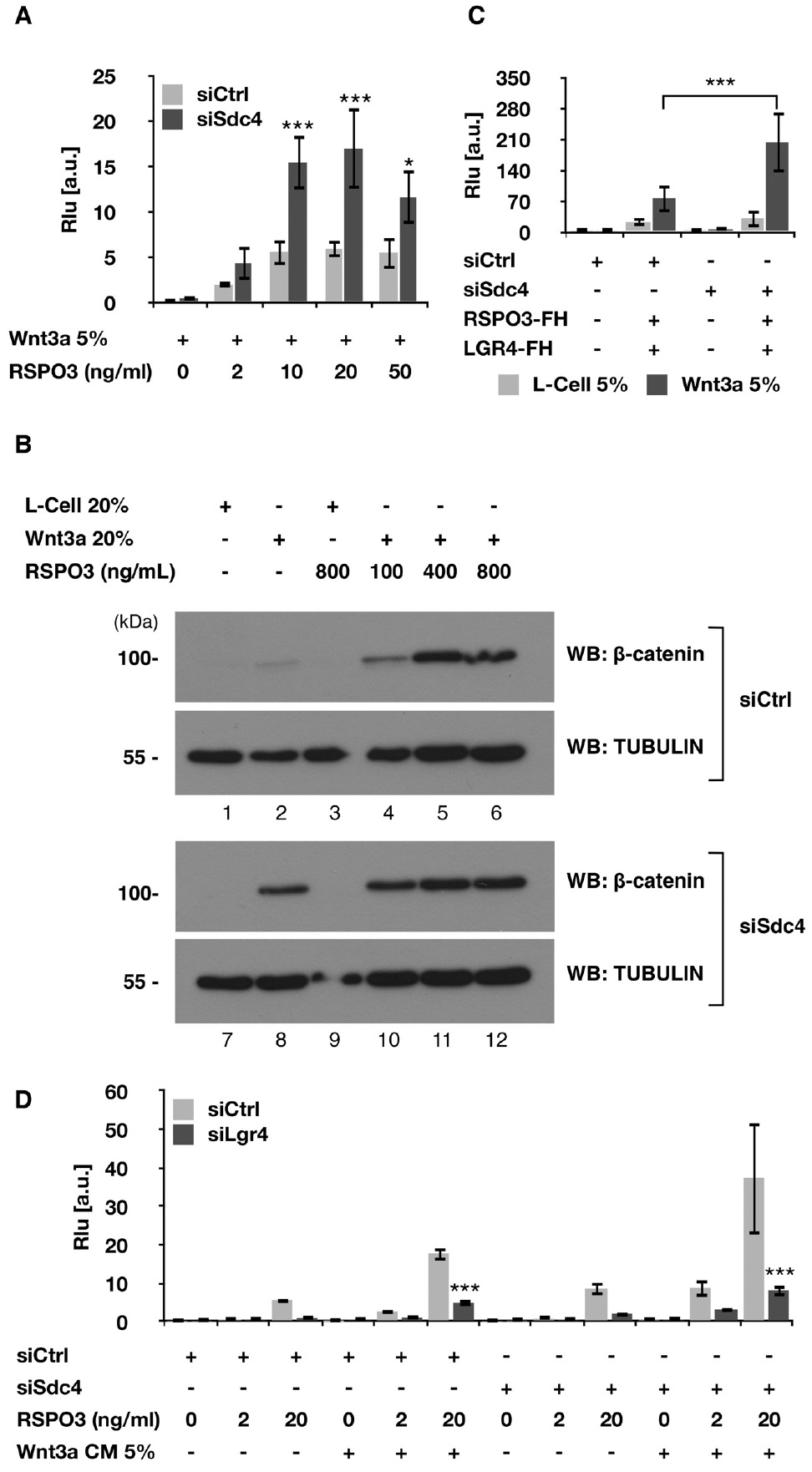 Fig. 5. Enhanced canonical activity of R-spondin 3 (RSPO3) in response to SDC4 knockdown. (A) HEK293 cells were transfected with siSdc4 or control siRNA, and stimulatedwith low doses of Wnt3a CM and increasing concentrations of purified RSPO3. Knockdown of SDC4 increases the ability of RSPO3 to enhance Wnt/-catenin signaling. (B)L-Cells were transfected with siCtrl or siSdc4, and -catenin stabilization after 1 h of stimulation with Wnt3a CM, plus purified RSPO3 or vehicle, was visualized. (C) HEK293cells were co-transfected with Rspo3-Flag/HA (Rspo3-FH) and Lgr4-Flag/HA (Lgr4-FH) and the indicated siRNAs, and stimulated with low doses of Wnt3a CM. Knockdownof SDC4 enhances TOPFlash activity in response to RSPO3 plus LGR4. (D) Knockdown of the RSPO3 receptor, LGR4, abrogates the potentiation observed when SDC4 levelsare reduced. HEK293 cells were transfected as indicated, and stimulated with low doses of Wnt3a CM and increasing concentrations of purified RSPO3. *p < 0.05; **p < 0.01;***p < 0.001, by two-way ANOVA followed by Bonferroni post hoc test; WB, Western Blot.