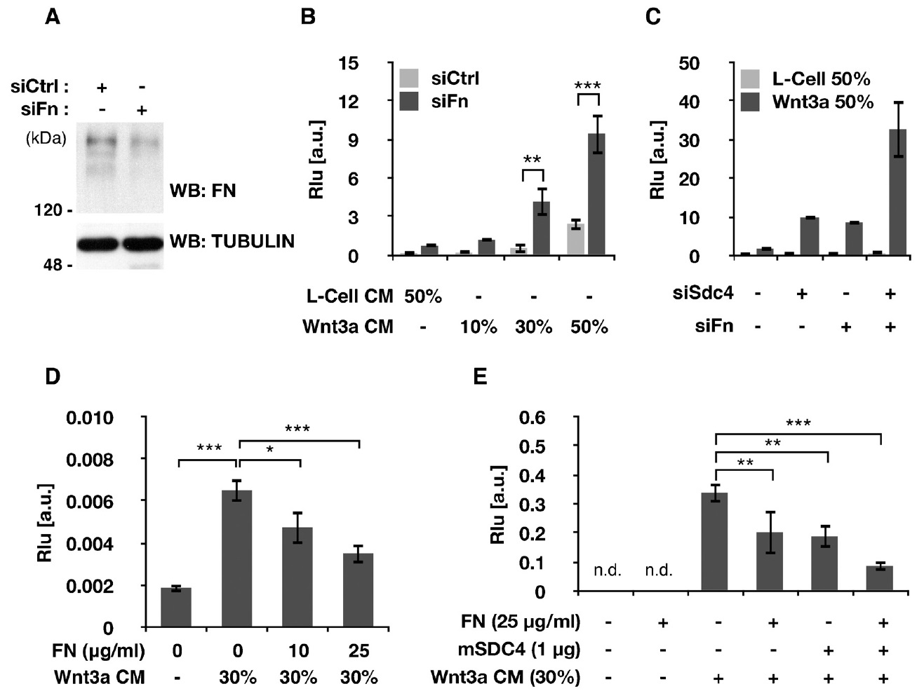 Fig. 3. Fibronectin (FN) loss-of-function enhances Wnt/-catenin signaling. (A and B) FN knockdown using siRNA (siFn; A) enhances TOPFlash activity in response to increasingconcentrations of Wnt3a CM (B). **p < 0.01, ***p < 0.001, by two-way ANOVA followed by Bonferroni post hoc test (B). (C) siFn and siSdc4 have a cooperative effect on TOPFlashactivity, compared with each siRNA transfected separately, in HEK293 cells. (D) Culture of cells upon recombinant FN decreases Wnt/-catenin signaling; in HeLa cells in aconcentration-dependent manner. *p < 0.05, ***p < 0.001, by one-way ANOVA followed by Tukey post hoc test. (E) MEFs from Sdc4 −/− mice were stimulated with Wnt3a CMand treated as indicated. Both culture of MEFs upon recombinant FN, or rescue of mouse SDC4 (mSDC4) expression, decreased Wnt/-catenin signaling (see bars 4–5). Bothtreatments combined have a cooperative effect, further decreasing TOPFlash activity (bar 6). **p < 0.01, ***p < 0.001, by one-way ANOVA followed by Tukey post hoc test; n.d.,not detected. WB, Western Blot.