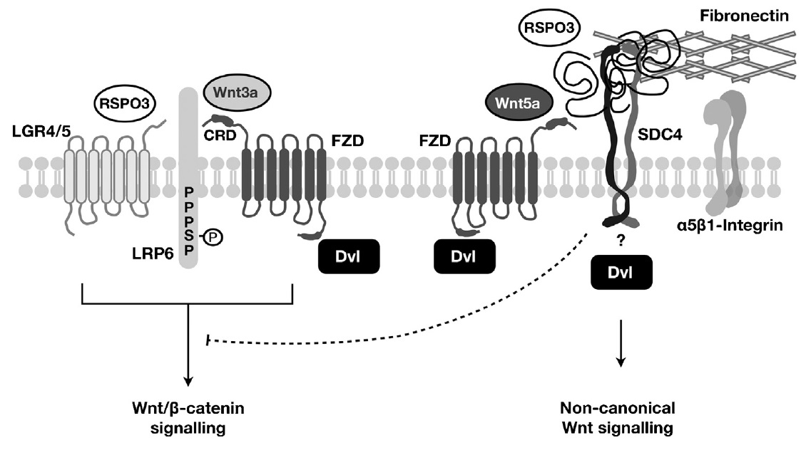 Fig. 6. Model for the regulation of Wnt signaling by SDC4. Wnt/-catenin signaling, initiated by Wnt ligands, relies on receptors (Frizzled, FZD) and co-receptors (LRP6) atthe plasma membrane, plus synergic activities of Rspo ligands, inducing LRP6 phosphorylation, by mechanisms mediated by Dishevelled and other cytoplasmic proteins.Non-canonical Wnt signaling mediated by Wnt ligands, such as Wnt5a, is initiated by plasma membrane components and through mechanisms involving also Frizzledreceptors and Dishevelled. SDC4 participates in this process, by interacting functionally with Dishevelled and Frizzled-7 (see Mu˜noz et al., 2006; Carvallo et al., 2010), andalso with RSPO3 (Ohkawara et al., 2011). It is likely that the participation of SDC4 may be related with adhesion proteins, such as Fibronectin and integrins; this may resultin titration of RSPO3, or competition with intracellular proteins, resulting in inhibition of the Wnt/-catenin signaling.