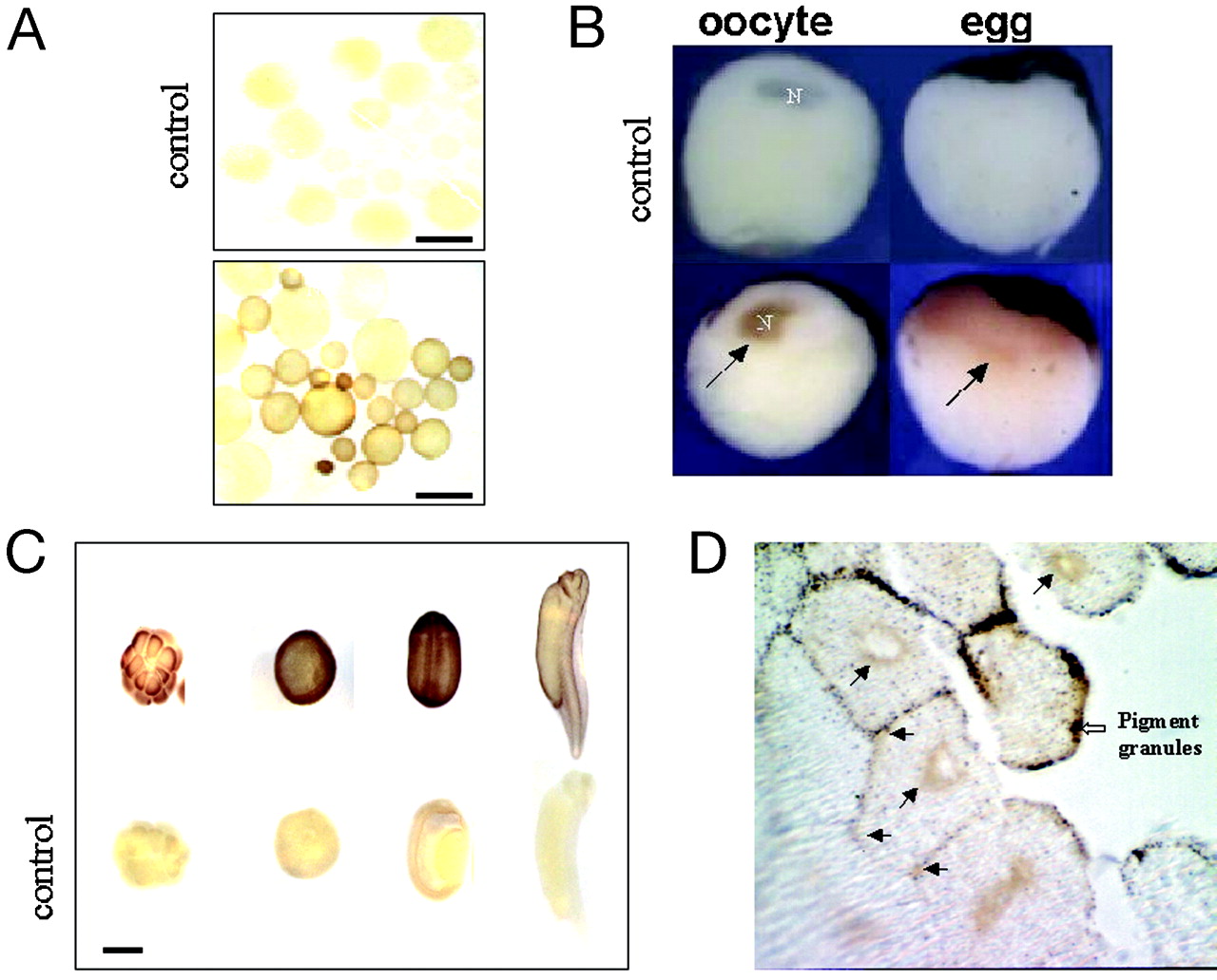 xARH expression in oocytes and embryos. Affinity-purified mouse polyclonal anti-xARH-C antibody was used for whole-mount immunostaining of oocytes and embryos. No signal was detected in oocytes or embryos stained with antibody blocked with the purified antigen GST-C. A, in oocytes, ARH appears to be concentrated peripherally. B, in bisected stage V oocytes, ARH is perinuclear (arrow), and in bisected eggs after germinal vesicle breakdown, the signal is mostly in the animal hemisphere (arrow). N, nucleus. C, xARH protein is found broadly distributed in early stage embryos. D, in sectioned blastula stage embryos, ARH is found in the perinuclear (arrows) as well as the cortical region (arrows). Black pigment granules (open arrow) are distinct from the brown ARH-positive staining. Bar = 1 mm.