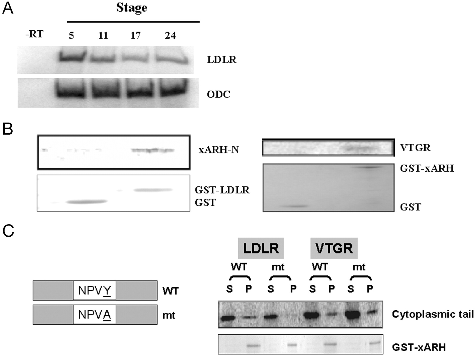 xARH interacts with the LDL and VTG receptors. A, total RNA was isolated from embryos at different stages and xARH expression analyzed by reverse transcriptase-PCR. Ornithine decarboxylase (ODC) served as the loading control. Reaction without reverse transcriptase added (âRT) was used as the negative control. B, GST pull-down assays showing interaction between xARH and the LDL and VTG receptors. In vitro translated and 35S-Met labeled xARH-N terminus (residues 1â212) or VTGR was mixed with purified GST-LDLR or GST-xARH. The GST fusion proteins and bound proteins were pulled down with glutathione-Sepharose beads and analyzed by SDS-PAGE. The GST fusion proteins were visualized by Coomassie Blue staining. The in vitro translated proteins were detected by exposure to a PhosphorImager screen. C, the cytoplasmic tails of the LDLR and VTGR were translated in vitro and labeled by 35S-Met incorporation. In mutants (mt), the NPVY motifs were changed to NPVA. Purified GST-xARH fusion protein from E. coli was mixed with the cytoplasmic tails and glutathione-Sepharose beads. The beads were spun down and boiled in SDS loading buffer (pellet). Both the supernatant (S) and pellet (P) fractions were resolved by SDS-PAGE. The cytoplasmic tails were visualized by exposure to a PhosphorImager screen. The GST-xARH protein was detected by Coomassie Blue staining.