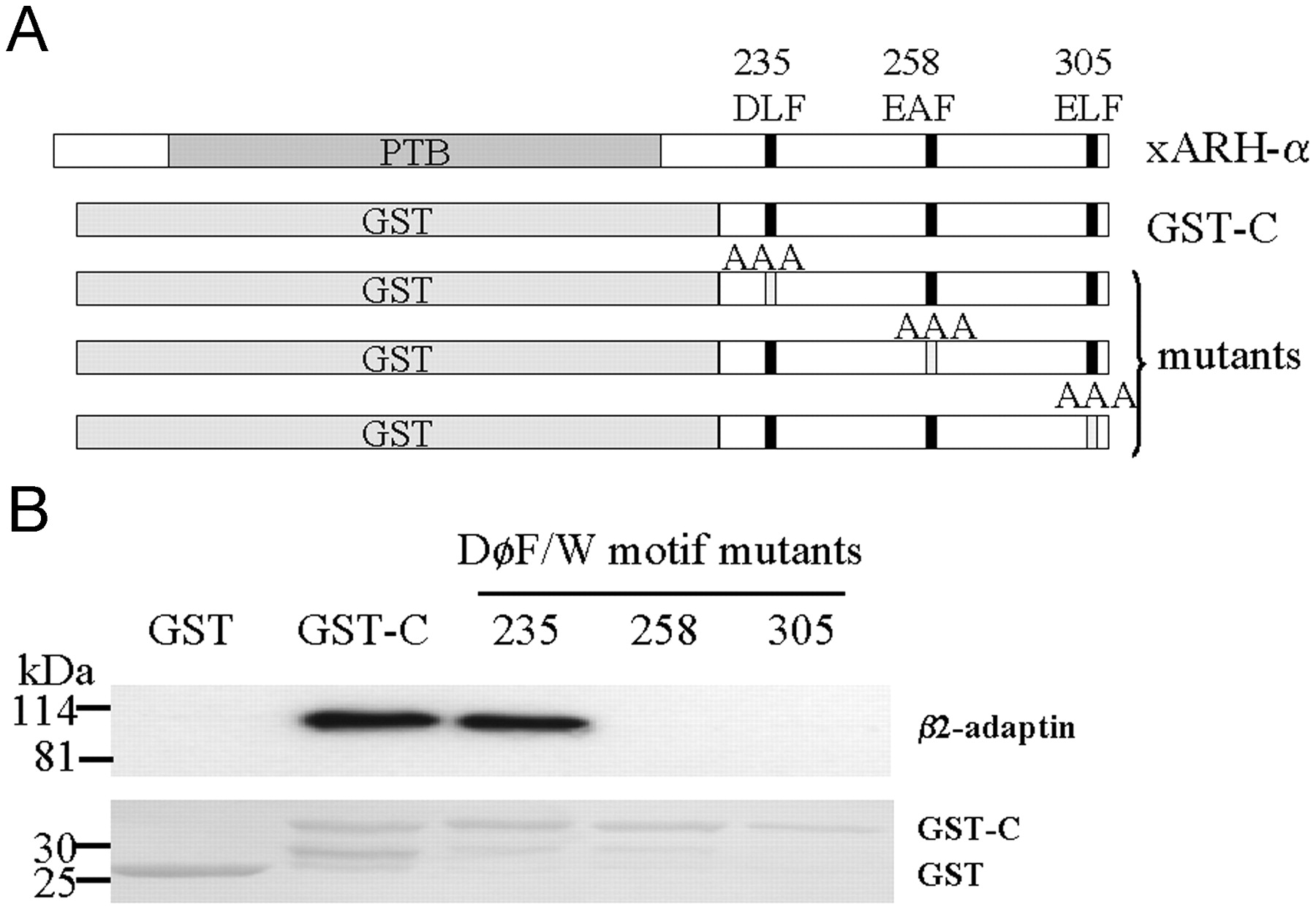 DÏ(F/W) motifs are required for the interaction between xARH and the AP-2 complex. A, diagram of xARH mutants fused to GST used in the analysis of the DÏ(F/W) motifs. The DÏ(F/W) motifs at positions 235, 258, and 305, respectively, were individually mutated to AAA. B, fusion proteins were used in pull-down assays to test for the binding of β2-adaptin to ARH and were analyzed subsequently by Western blotting. The nitrocellulose membrane was stained with Ponceau S to visualize the GST fusion proteins and to confirm equal loading. GST and GST-C served as the negative and positive controls, respectively.
