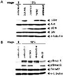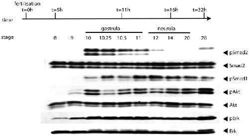 Figure 2. Kinetics of the activation of signalling molecules during early Xenopus development.X. laevis embryos were collected at the time indicated and subjected to Western blot analysis. Membranes were probed with anti-phospho-Smad1/5/8 (pSmad1) antibody for monitoring BMP activity, anti-phospho-Smad2 (pSmad2) antibody for TGF-β/Nodal signalling, anti-phospho-Erk (pErk) for MAPK/Erk signalling and anti-phospho-Akt (pAkt) for PI3K/Akt signalling. Anti- Smad2, anti- Akt, and anti-Erk were used as loading controls to ensure all lanes have been loaded equally.