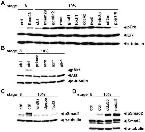 Figure 6. Results of the screen.The 20 active clones identified during the screen were individually injected and analysed by Western blot to demonstrate their abilities to modulate the activities of different signalling pathways as shown in Table 3. Embryos were collected at the indicated stages, processed, and analysed by Western blot to assess the activities of Erk (pErk, panel A), Akt (pAkt, panel B), BMP (pSmad1, panel C), and TGFβ/Nodal (pSmad2, panel D). Control (ctrl) denotes uninjected embryos. Anti-Erk (Erk), anti-Akt (Akt), anti-Smad2 (Smad2) and anti-α-Tubulin (α-Tubulin) were used as loading controls.