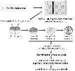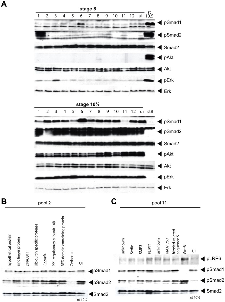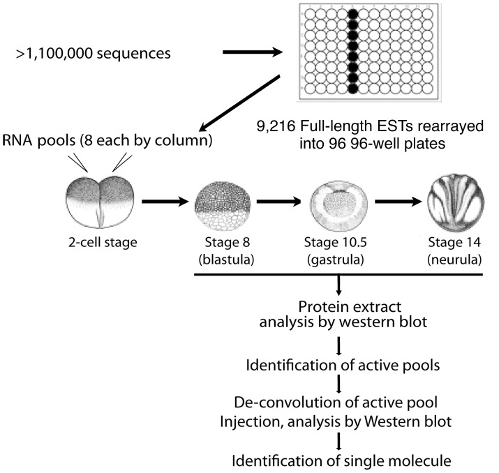 Figure 3. Flowchart of the experimental procedure of the screen.A X. tropicalis library of unique, full-length clones has been established based on sequence comparison and clustering of over 1,220,000 ESTs, and rearrayed in a 96-well plate format. Pools of 8 mRNAs were prepared from pooled bacteria culture and in vitro transcription. Then in vitro transcribed mRNA pools were injected into fertilized X. laevis embryos at 1â2 cell stage. After microinjection, injected embryos were collected at stage 8 (blastula), stage 10.5 (gastrula), and stage 14 (neurula). Protein extracts from embryos were loaded onto SDS-PAGE for subsequent Western blot analysis. Antibodies used include anti-phospho-Smad1/5/8, anti-phospho-Smad2, anti-phospho-Akt, and anti-phospho-Erk. Once a potential active pool was identified, the pool was de-convoluted and single molecule injection was performed to identify the active molecule.