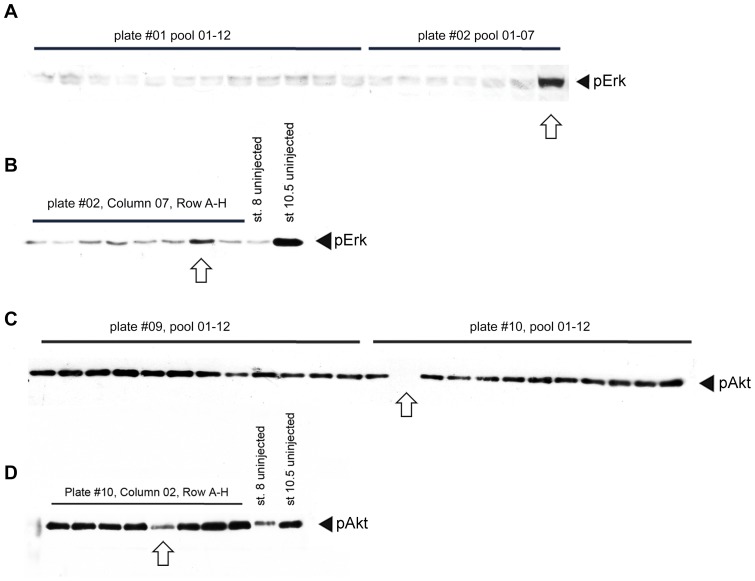 Figure 5. Examples on identification and de-convolution of active regulators.(AâB) identification of the MAPK/Erk activator fbxo43 (erp1). (A) Western blot of stage 8 embryos injected with 12 pools (01â12) derived from plate #01 and 7 pools (01â07) from plate #02 and probed with anti-phospho-Erk (pErk) antibody. The arrow indicates increased Erk phosphorylation upon injection of mRNAs derived from plate #02, pool 07. (B) De-convolution of the above pool. Embryos injected with single RNAs were collected at stage 8 and uninjected lysate from stage 8 and stage 10.5 were used as negative and positive control of Erk phosphorylation respectively. The arrow indicates the active clone of TEgg009F05, identified in plate #2, column 08, row G. This clone was confirmed as the X. tropicalis fbxo43 (erp1) gene. (CâD) Identification of PI3K/Akt inhibitor prkaca. (C) Western blot of stage 10.5 embryos injected with 24 pools (01â12) derived from plate #09 and #10 and probed with anti-phospho-Akt (pAkt) antibody. The arrow indicates decreased Akt phosphorylation upon injection of mRNAs derived from plate #10, pool 02. (D) De-convolution of the above pool. mRNA synthesis, injection, and Western blot were performed as in (B) except that stage 10.5 embryos were used. The arrow indicates the active clone of TEgg046d13 is identified in plate #09, column 02, row E. This clone was later identified as encoding the X. tropicalis prkaca gene.