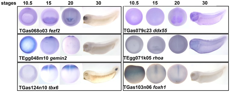 Figure 7. Whole-mount in situ hybridisation images on clones with regionalised expression patterns.For each clone the corresponding clone number and Xenopus gene symbol are shown. Vegetal view (stage 10.5 except for foxh1, which is side view); dorsal view (stage 15 and 20, posterior is up); lateral view (stage 30, anterior is to the left).