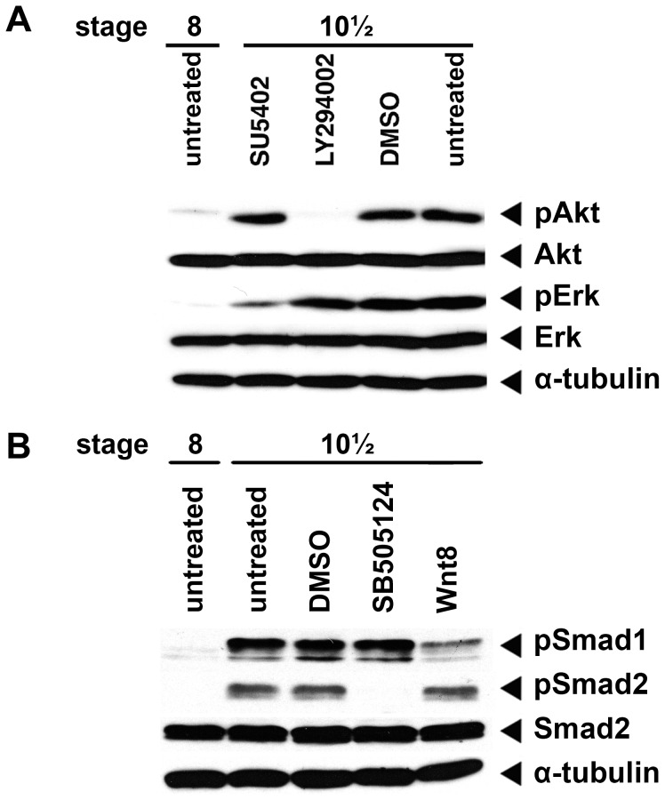 Figure 1. Characterisation of phospho-specific antibodies.(A) Characterisation of anti-phospho-Akt (pAkt) and anti-phospho-Erk (pErk) antibodies, the PI3K/Akt inhibitor LY294002 and FGF inhibitor SU5402 were used to inhibit Akt and Erk phosphorylation in gastrula embryos, respectively. 1% DMSO was used to exclude any possible interference from the inhibitor solvent. Anti-Erk (Erk), anti-Akt (Akt) and anti-α-tubulin (α-tubulin) were used as loading controls. (B) Characterisation of anti-phospho-Smad1/5/8 (pSmad1) and anti-phospho-Smad2 (pSmad2) antibodies. The TGF-βRI inhibitor SB505124 was used to inhibit Smad2 phosphorylation in gastrula embryos; injection of wnt8a mRNA was used to inhibit bmp4 expression, thus preventing Smad1/5/8 phosphorylation. All inhibitors have been added at stage 6. 1% DMSO was used to exclude any possible interference from the inhibitor solvent. Smad2 and α-tubulin serves as internal controls to ensure equal loading in all lanes.
