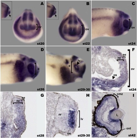 Fig. 1. Expression of etv1 in the developing Xenopus laevis eye. Etv1 is detected by whole mount in situ hybridization during optic vesicle evagination (A, anterior view â bracket; inset, lateral view â arrow), in the pre-neurogenic optic vesicle (B, anterior view â bracket; inset, lateral view â arrow), and during the initial stages of retinal neurogenesis, (C and D, lateral view). By stage 29â30, etv1 is only expressed in the developing lens vesicle (E, lateral view â arrowhead). In situ hybridization on sections shows etv1 is most highly expressed in the ventral stalk and ventral optic vesicle at stage 24, with weaker expression in the neuroepithelium of the central to dorsal optic vesicle, and overlying surface ectoderm (F). At stage 28, etv1 is expressed throughout the retinal neuroepithelium and overlying surface ectoderm (G). At stage 29â30, the developing lens vesicle is strongly labeled, while there is no detectable expression of etv1 in the developing neural retina (H). At the end of embryonic retinal neurogenesis, etv1 is expressed in the photoreceptors of the outer nuclear layer but is absent from the rest of the central retina and also from progenitors in the ciliary marginal zone (I). Abbreviations: ov, optic vesicle; e, eye; lv, lens vesicle; se, surface ectoderm; ne, neuroepithelium; os, optic stalk; nr, neural retina; cmz, ciliary marginal zone; onl, outer nuclear layer.