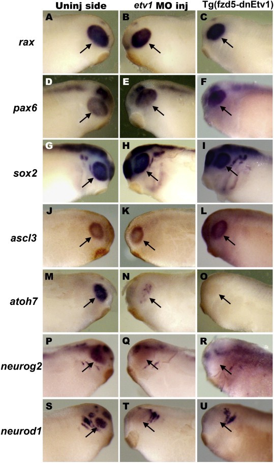 Loss of Etv1 function prevents proneural gene expression. Etv1 function was blocked by injection of etv1 MO at the 8-cell stage (B,E,H,K,N,Q,T) or by transgenic expression of dnEtv1 using the eye-specific enhancer for human fzd5 (C,F,I,L,O,R,U). In situ hybridization on stage 28 embryos showed that expression of early retinal markers were unaffected relative to the uninjected side, including rax (A and B, n = 78/82 unaffected; C, n = 32/32), pax6 (D and E, n = 59/65; F, n = 15/15), sox2 (G and H, n = 51/58; I, n = 28/28), and the pre-neurogenesis bHLH gene ascl3 (J and K n = 37/37; L, n = 32/32). Expression of proneural bHLH genes required for retinal neurogenesis was reduced compared to the uninjected side: atoh7 (M and N, n = 70/124 reduced; O, n = 56/98), neurog2 (P and Q, n = 39/61; R, n = 20/34), and neurod1 (S and T, n = 53/103; U, n = 18/28). Arrows indicate the eye.