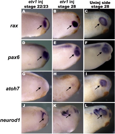 Etv1 overexpression does not trigger early retinal neurogenesis. Early retinal patterning genes rax (AâC) and pax6 (DâF) were unaffected by 8-cell injection of mRNA for etv1. The proneural bHLH gene atoh7 (G, n = 49) and neurod1 (J, n = 76) were not expressed prematurely at stage22/23, indicating that etv1 was insufficient to initiate their expression. At stage 28, expression of both atoh7 (H and I) and neurod1 (K and L) was reduced on the injected side compared to the uninjected side (n = 24/48 for atoh7; n = 20/34 for neurod1). Arrows indicate the eye.