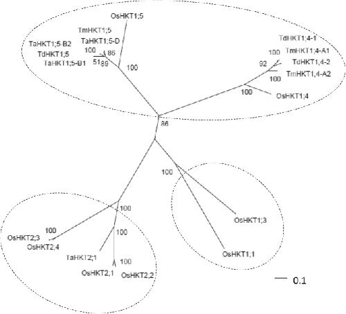 Fig. 1. Phylogenetic relationships between HKT transporters in rice and wheat. The unrooted phylogenetic tree was constructed using full polypeptide sequences aligned with MUSCLE (http://www.bioinformatics.nl/tools/muscle.html; Dereeper et al., 2008), and the neighbour-joining method with 1000 bootstrap replicates, using PhyML software (http://phylogeny.lirmm.fr). The tree was drawn using Dendroscope (Huson et al., 2007). Bootstrap values (as percentages) are indicated at the corresponding nodes. The protein accession numbers are: OsHKT1;1, Q7XPF8.2; OsHKT1;3, Q6H501.1; OsHKT1;4, Q7XPF7.2; OsHKT1;5, Q0JNB6.1; OsHKT2;1, Q0D9S3.1; OsHKT2;2, BAB61791.1; OsHKT2;3, Q8L481.1; OsHKT2;4, Q8L4K5.1; TaHKT1;5-B1, ABG33943; TaHKT1;5-B2, ABG33944; TaHKT1;5-D, ABG33945; TaHKT2;1, AAA52749; TmHKT1;4-A1, ABK41858; TmHKT1;4-A2, ABK41857; TmHKT1;5, ABG33939; TdHKT1;4-1, KF443078; TdHKT1;4-2, KF443079. Os, Oryza sativa; Ta, Triticum aestivum; Td, Triticum turgidum subsp. durum; Tm, Triticum monococcum.