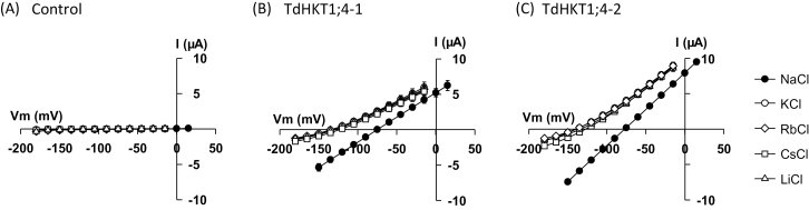 Fig. 2. TdHKT1;4-1 and TdHKT1;4-2 function as monovalent cation transporters with a strong preference for Na+ in Xenopus oocytes. Bath solutions contained the standard background supplemented with NaCl, KCl, RbCl, CsCl, or LiCl, at 3mM. The voltage-clamp protocol consisted of 12 pulses of 1 s, with a voltage increment of 15 mV between pulses. (A) Currents from control (H2O-injected) oocytes plotted against applied voltages. (B, C) Currents flowing through TdHKT1;4-1 (B) and TdHKT1;4-2 (C) transporters versus applied voltages. Data are means±standard error (SE) (n=4) and are representative of five experiments performed on different oocyte batches.