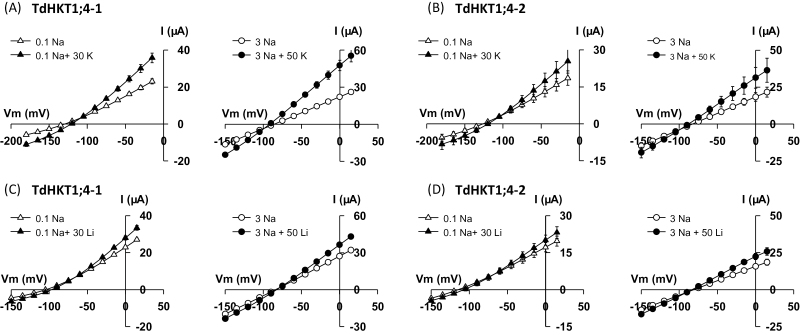 Fig. 4. Effect of external K+ and Li+ on Na+ transport by TdHKT1;4-1 (A, C) and TdHKT1;4-2 (B, D). Bath solutions contained 0.1mM (left panels) or 3mM (right panels) Na+ (glutamate salts). They were or were not supplemented with KCl (A, B) or LiCl (C, D), with concentration of the added salt being 30mM (left panels) or 50mM (right panels). Data are means±SE (n=7 in A, n= 6 in B, n= 5 in C, n=8 in D) and are representative of two experiments performed on different oocyte batches.
