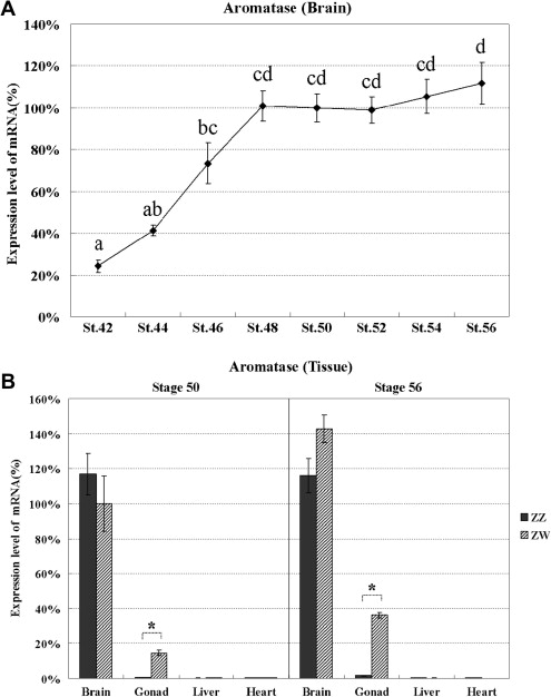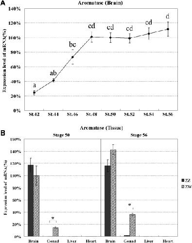 Expression patterns of aromatase mRNA in Xenopus at the larval stage. Aromatase mRNA levels were quantified in the mixture of ZZ and ZW brains at stages 42, 44, 46, 48, 50, 52, 54, and 56 (A) and in the ZZ or ZW brain, gonads, liver, and heart at stages 50 and 56 (B). The relative transcription levels of aromatase mRNA were normalized to the transcription level of EF-1αs mRNA. The expression level in brains at stage 50 was set at 100%. Each real-time RT-PCR analysis was performed at least in triplicate. Error bars represent the standard error (SE) of means. An asterisk indicates a significant difference of mRNA expression level between ZZ and ZW using a Student t-test (âP < 0.05).