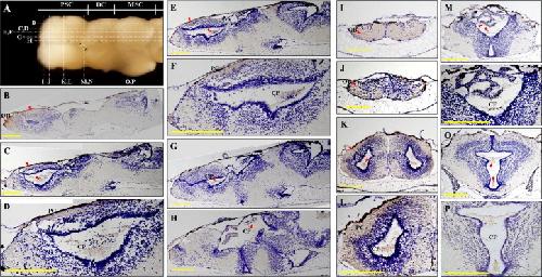 Localization of aromatase protein in Xenopus brain at stage 50. The brain at stage 50 from the dorsal viewpoint to show orientation of sections in B-P (A); the vertical section (BâH), and the cross section (IâP). Immunohistochemistry (IHC) staining was performed using anti-aromatase antibody followed by an HRP-conjugated anti-mouse IgG antibody. Nuclei were counterstained by hematoxylin. Red arrowheads show parts with strong staining. PSC, prosencephalon; DC, diencephalon; MSC, mesencephalon; PC, paleocortex; CP; choroid plexus, OB, olfactory bulb. Scale bars, 200 μm. (For interpretation of color in this Figure, the reader is referred to the web version of this article.)