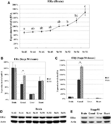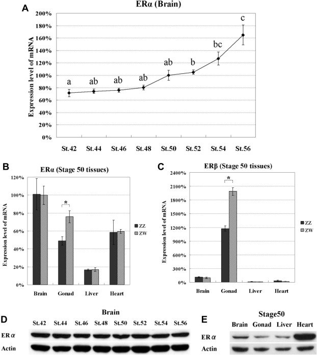 Expression characteristics of estrogen receptors (ERs) in Xenopus at the larval stage. ER mRNA levels were quantified in the mixture of ZZ and ZW brains at stages 42, 44, 46, 48, 50, 52, 54, and 56 (A) and in ZZ or ZW brain, gonads, liver, and heart at stage 50 (B and C) for ERα (A and B) and ERβ (C). The relative transcription levels of ER mRNA were normalized to the transcription level of EF-1αs mRNA. The expression level in the stage-50 brains was set at 100%. Each real-time RT-PCR analysis was performed at least in triplicate. Error bars represent the standard error (SE) of means. âP < 0.05. Western blotting analysis was performed using anti-ERα antibody and anti-actin antibody as an internal standard. Mix of nuclear and cytosolic extracts from the mixture of ZZ and ZW brains at stages 42, 44, 46, 48, 50, 52, 54, and 56 (D) and brain, gonads, liver, and heart at stage 50 (E) was examined by immunoblotting with each primary antibody followed by an HRP-conjugated anti-rabbit IgG antibody.
