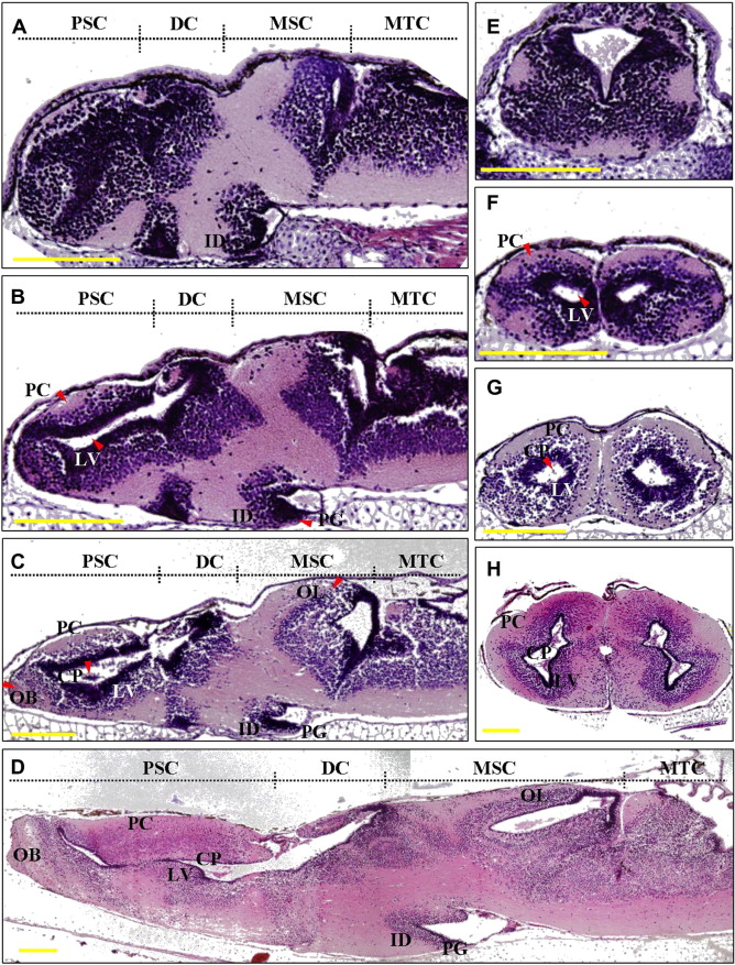 Morphological change of the Xenopus brain at stages 42–54. Vertical section of the hemisphere (A–D) and cross section of the prosencephalon (E–H) for stage 42 (A and E), stage 46 (B and F), stage 50 (C and G), and stage 54 (D and H) were stained with hematoxylin–eosin (HE). Arrowheads show the formation region at the stage. PSC, prosencephalon; DC, diencephalon; MSC, mesencephalon; MTC, metencephalon; ID, infundibulum; PG, pituitary gland; LV, lateral ventricle; PC, paleocortex; CP; choroid plexus, OB, olfactory bulb; OL, optic lobe. Scale bars; 200 μm.